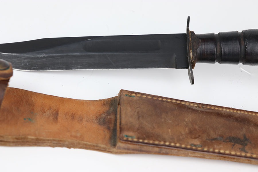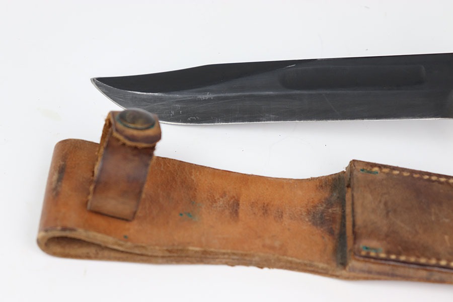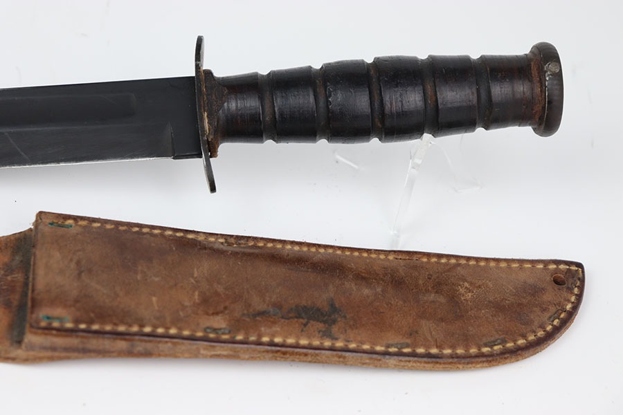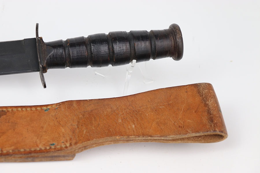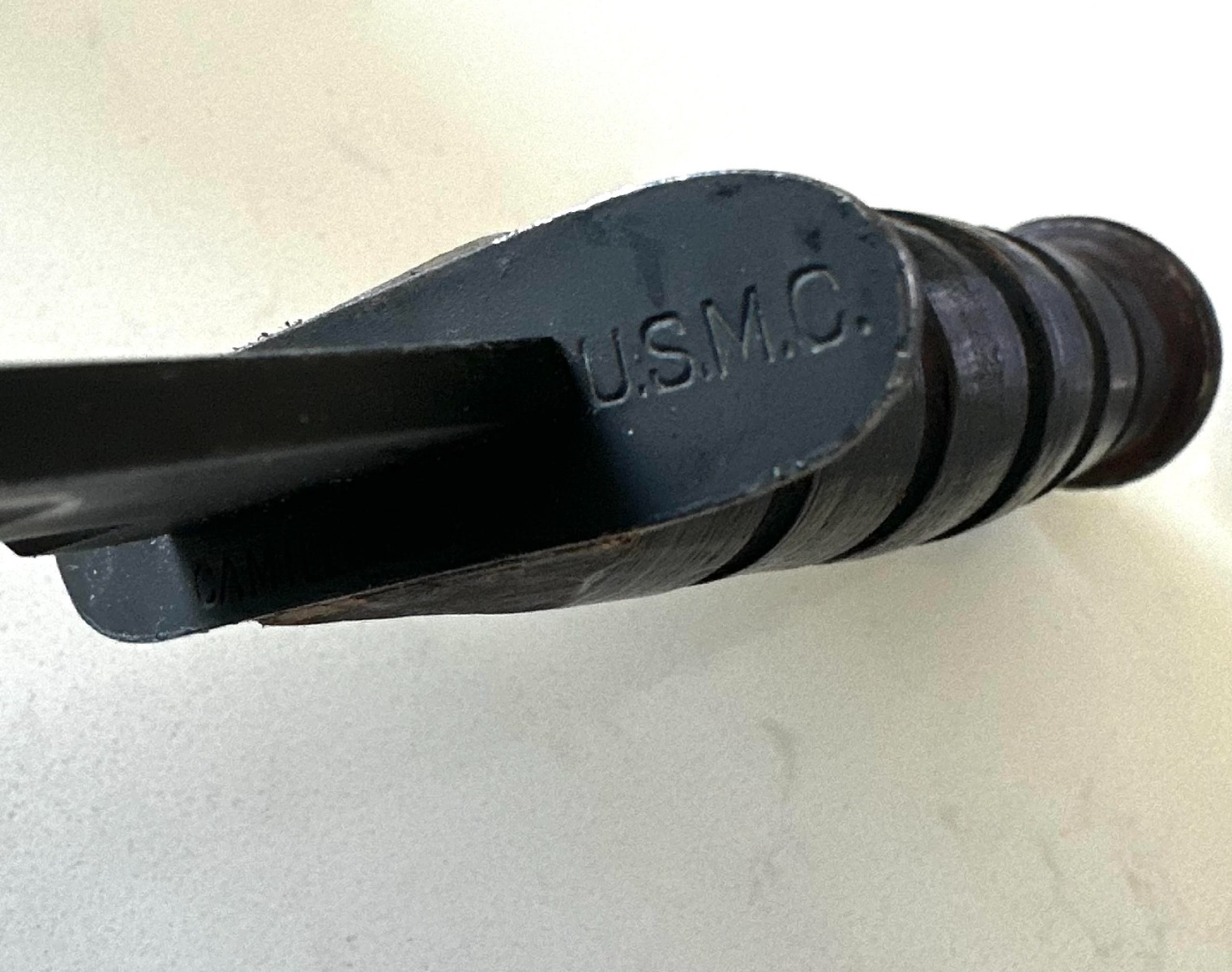 10/23/24 – This is an original Camillus MK2 U.S.M.C. fighting knife. It comes with the original leather sheath. The guard is marked U.S.M.C. Overall excellent condition with factory edge.