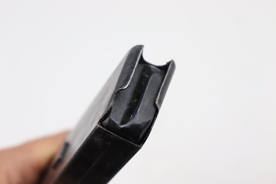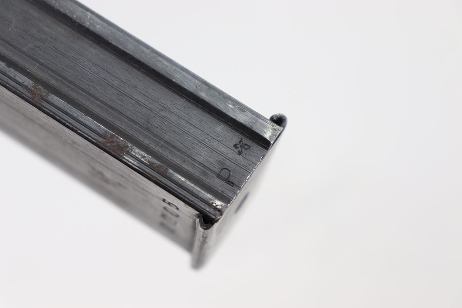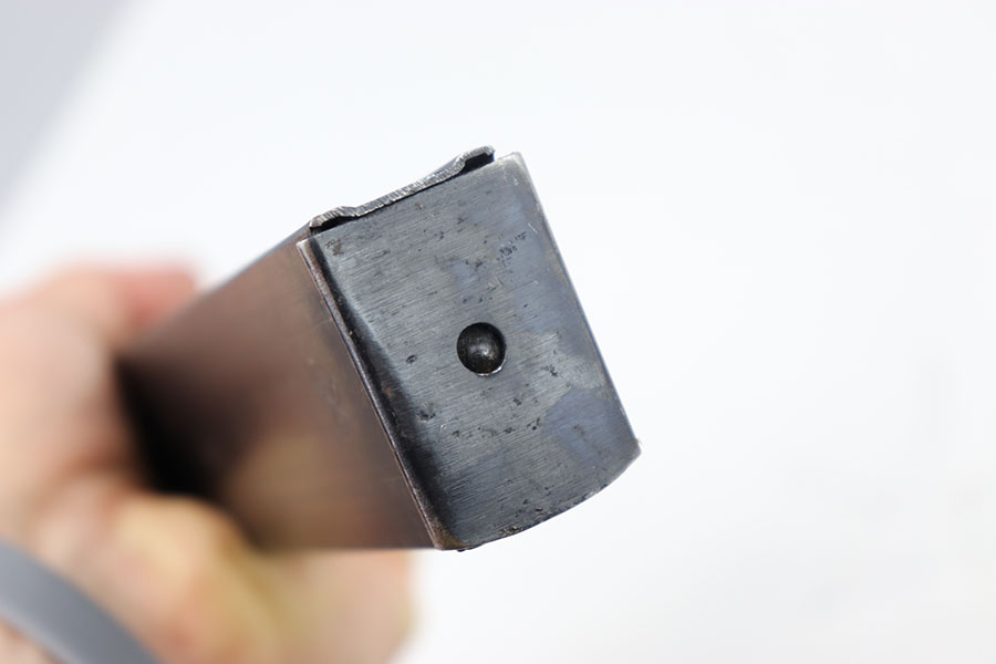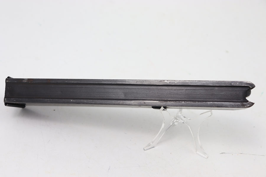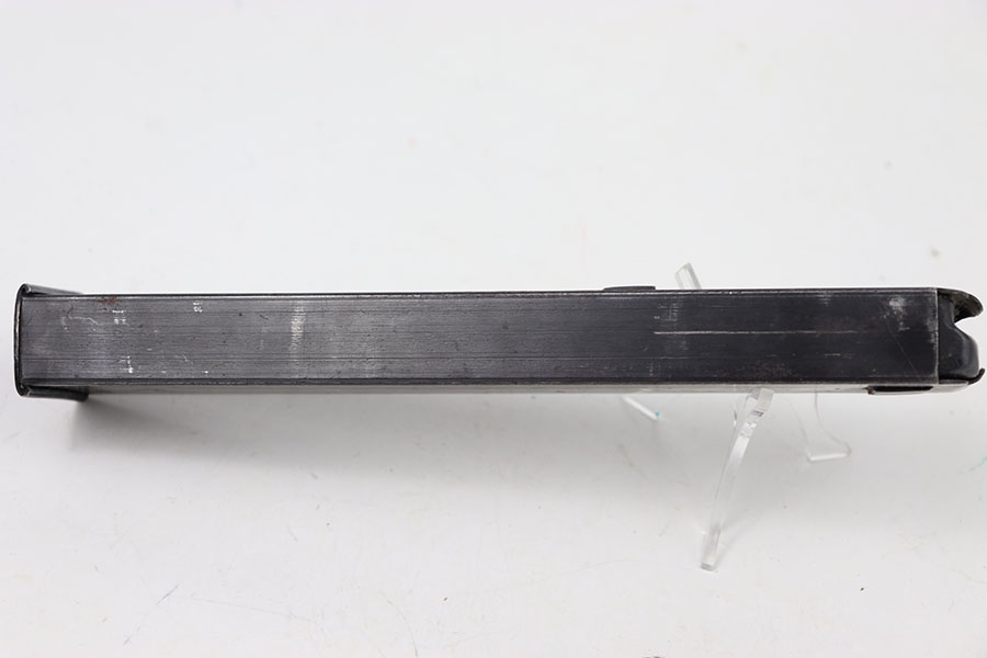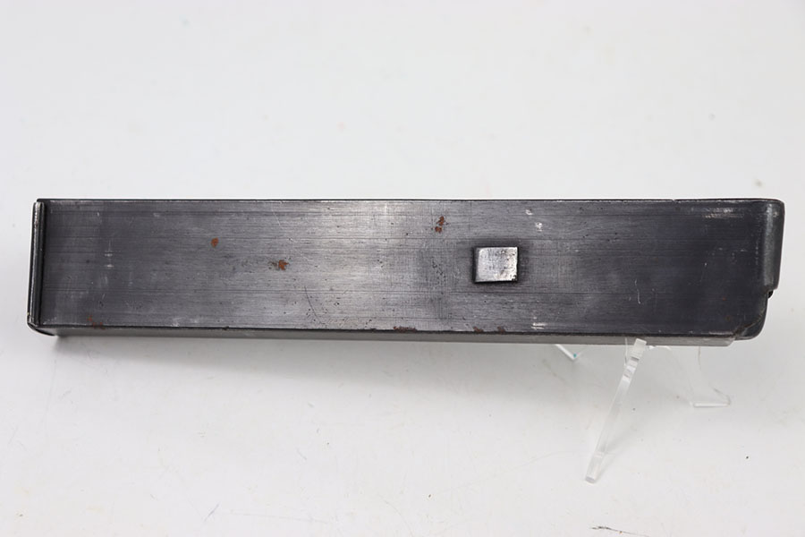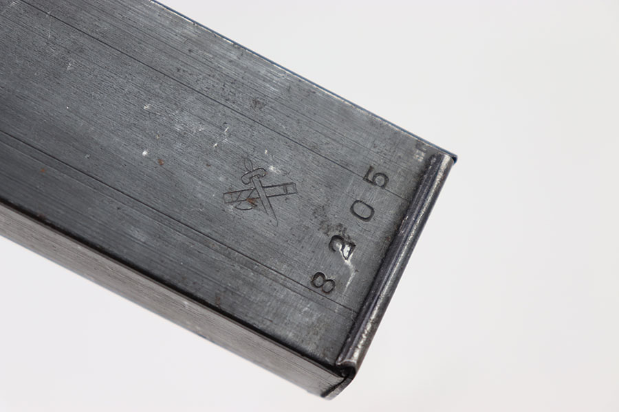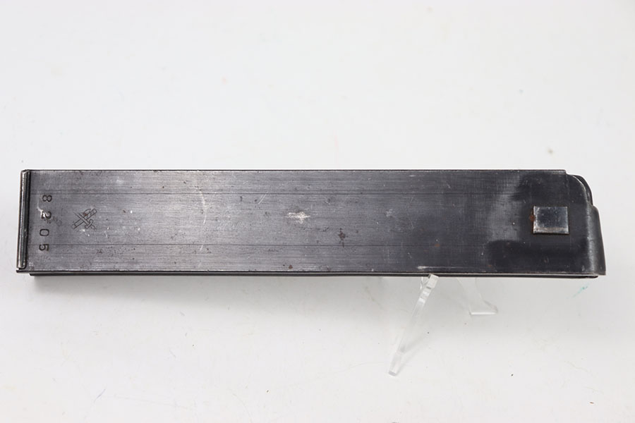 7/9/24 – This is an original WW2 Erma EMP 35 Magazine. This magazine holds 32 rounds of 9 x 23mm Largo. This magazine is fairly rare and especially in this condition. The magazine is stamped on the left side with a serial number and maker stamp. There are some minor spots of surface patina. There are markings on the base of the spine. Spring is strong and functional.