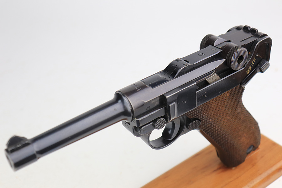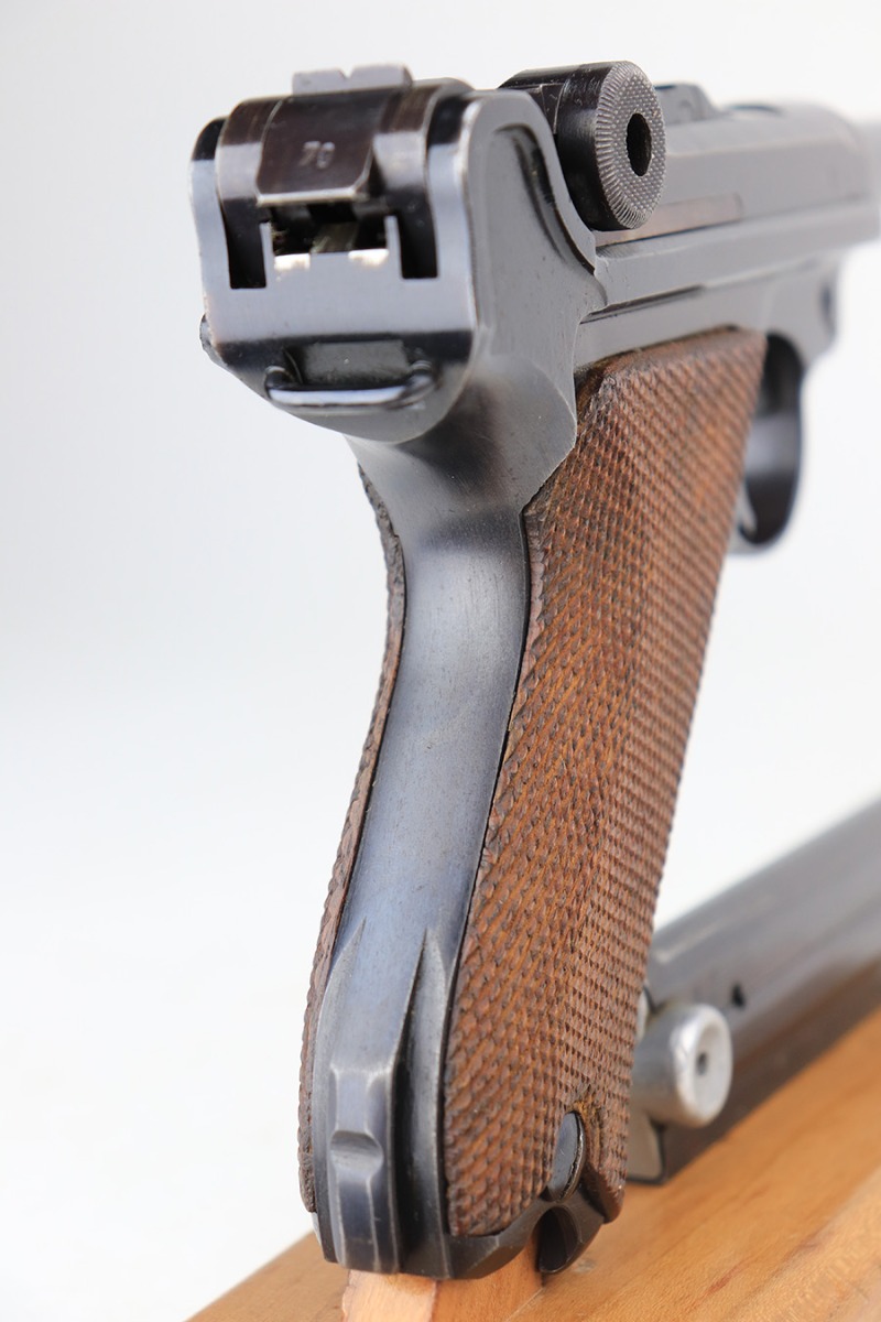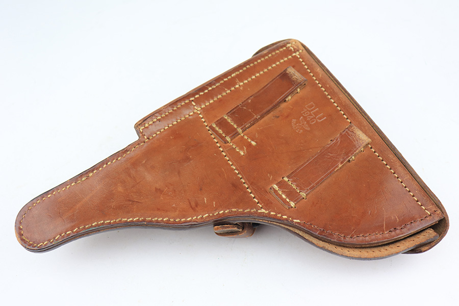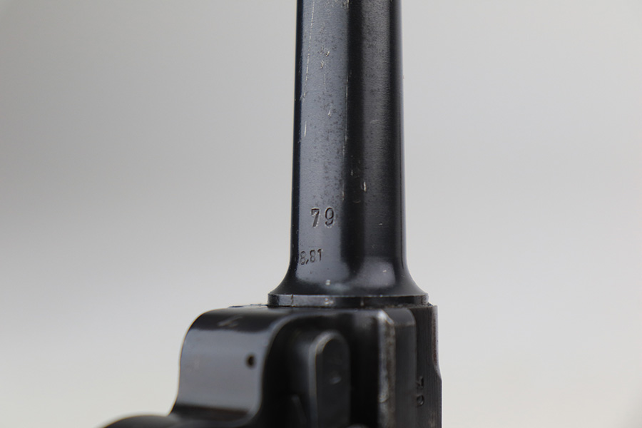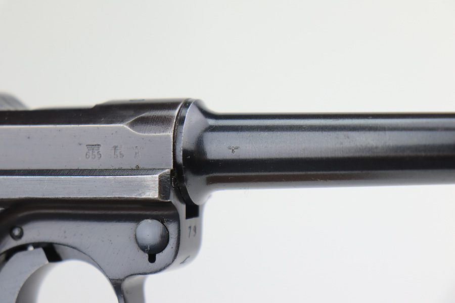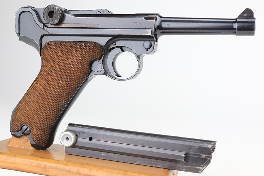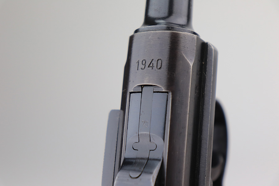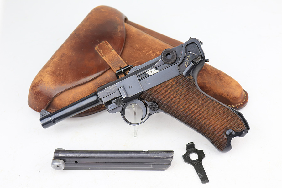 3/22/23 – This is a terrific 1940 Mauser Luger rig with the original, matching magazine. The pistol is all matching and correct with 97% of the blue remaining. Just minor edge wear from being in the holster, and a few dings on the left side of the frame. Terrific unmarked grips aside from the common chip under the safety. Bore has strong rifling but a little frost throughout. The listing includes an aftermarket tool, and a tan holster that is 1940 dated and ‘dlu’ maker marked. There is some separation between the two pieces of leather but a basic re-stitching would fix it.