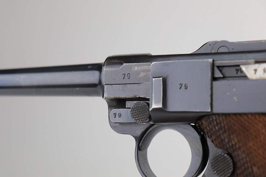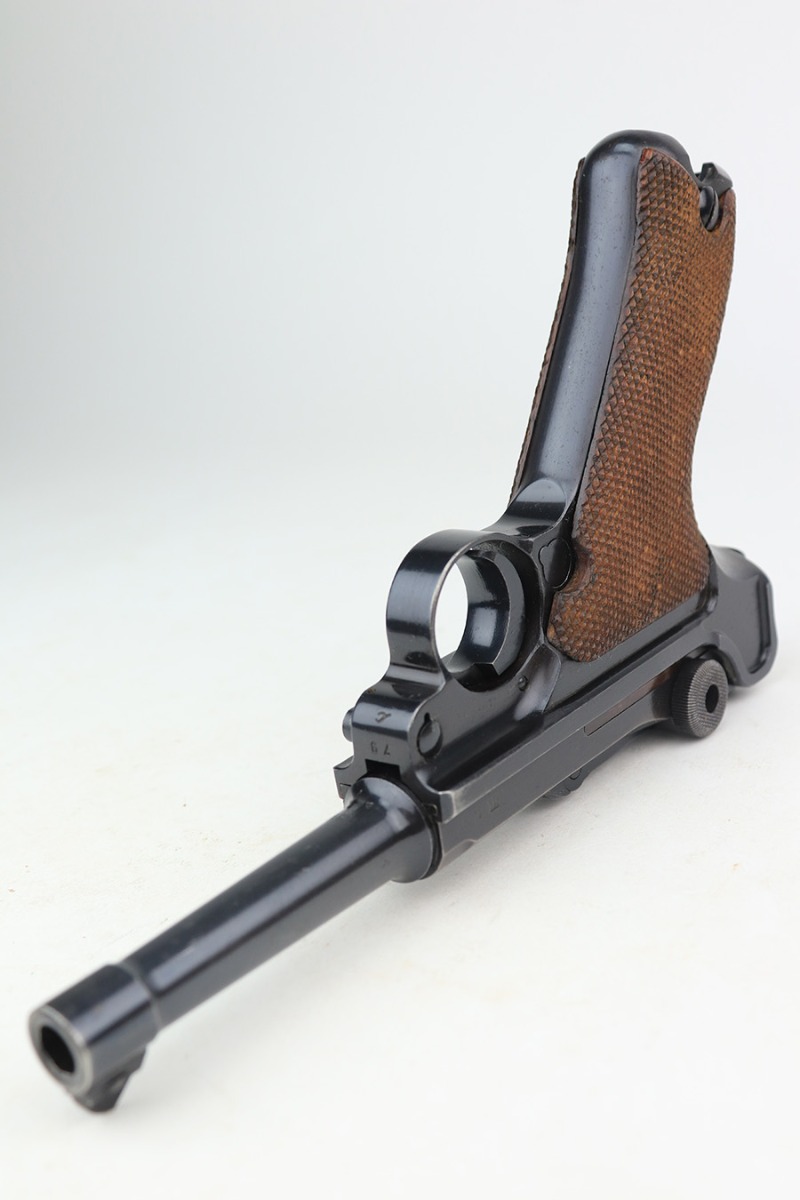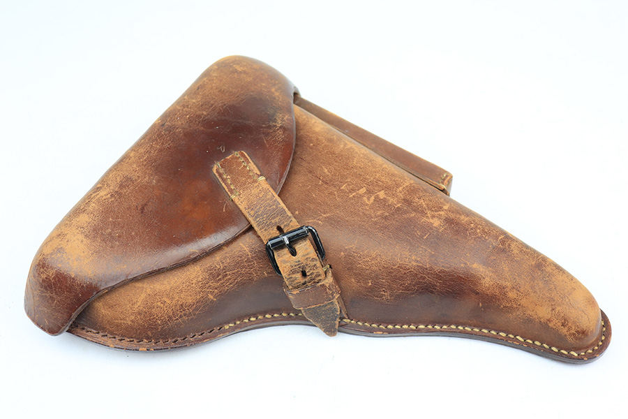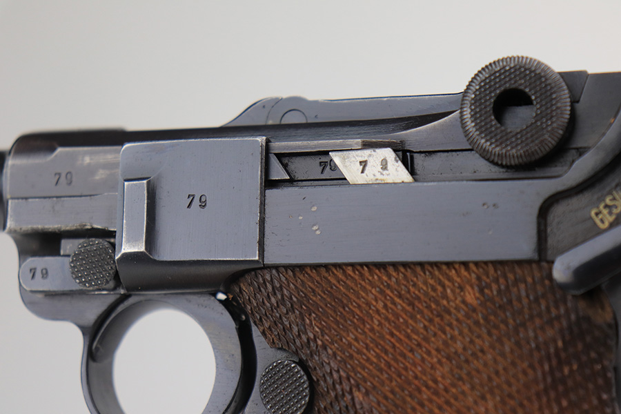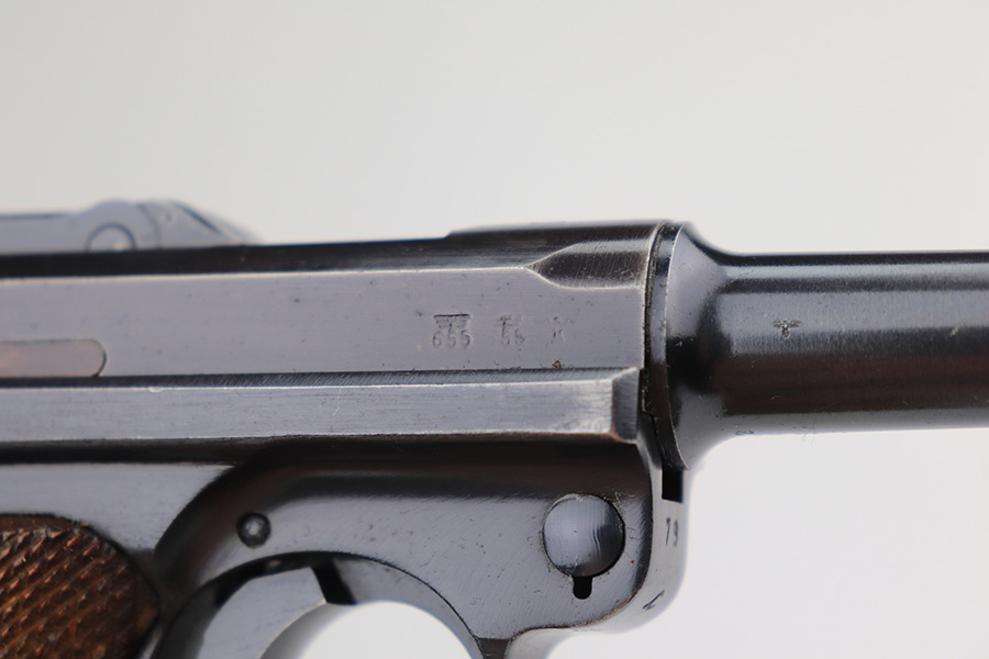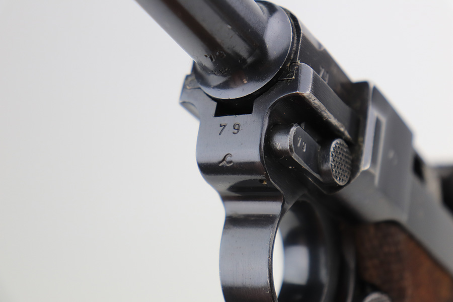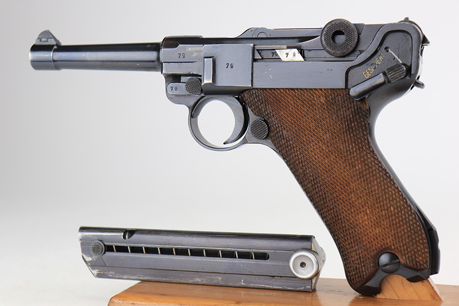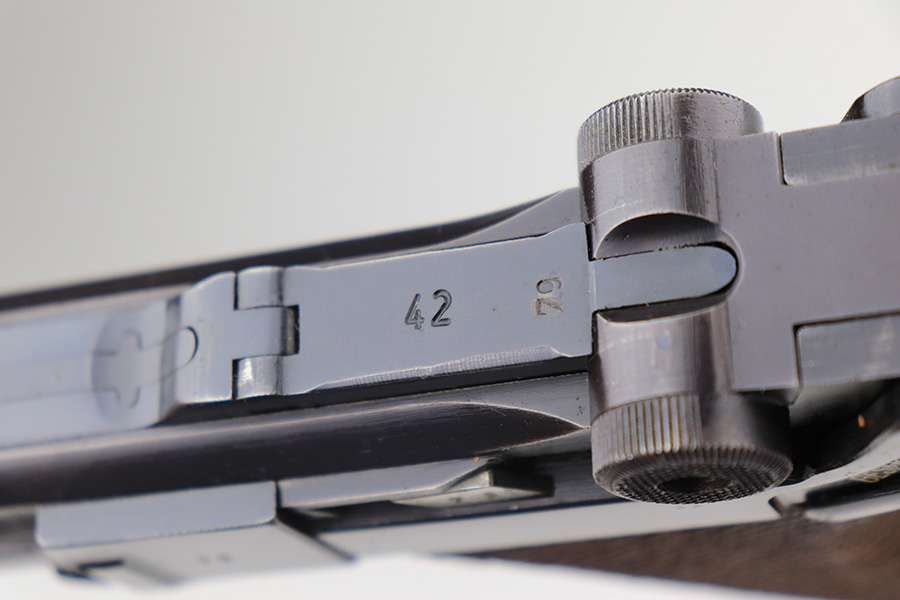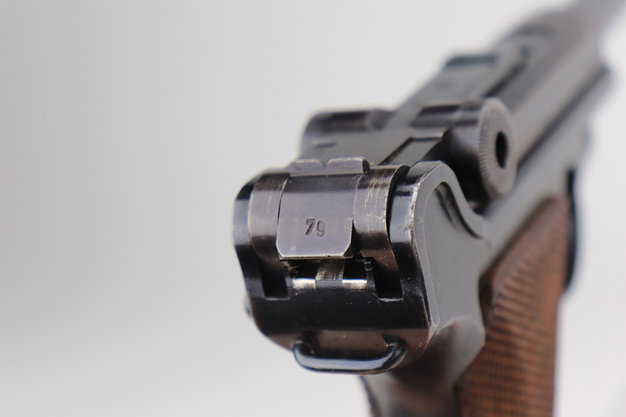 3/22/23 – This is a terrific 1940 Mauser Luger rig with the original, matching magazine. The pistol is all matching and correct with 97% of the blue remaining. Just minor edge wear from being in the holster, and a few dings on the left side of the frame. Terrific unmarked grips aside from the common chip under the safety. Bore has strong rifling but a little frost throughout. The listing includes an aftermarket tool, and a tan holster that is 1940 dated and ‘dlu’ maker marked. There is some separation between the two pieces of leather but a basic re-stitching would fix it.