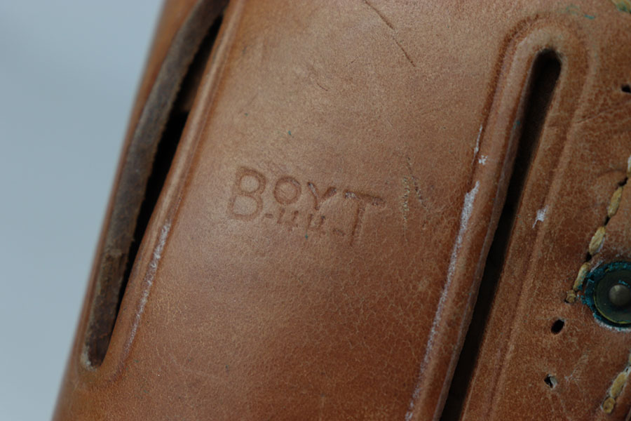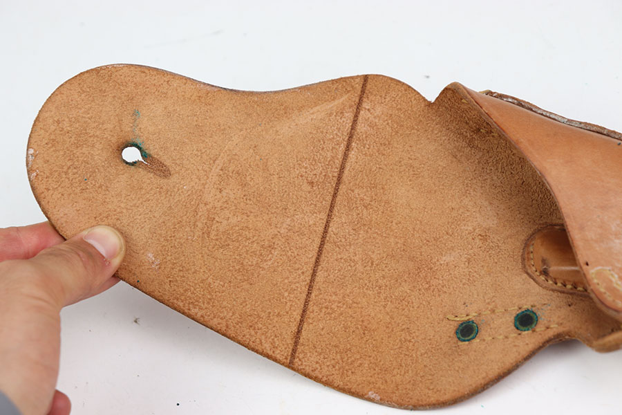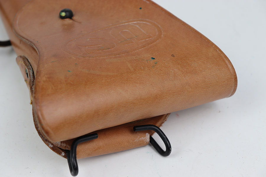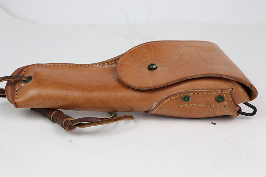 6/26/24 – This is an excellent example of a 1944 dated BOYT M1916 holster. This holsters leather is very clean with great pliability. Comes with its original leather lanyard. There are very few scratches or wear and no signs of cracking. The inside of the holster is also very clean. US marked on the front closure strap and BOYT 44 on the back. Excellent piece.