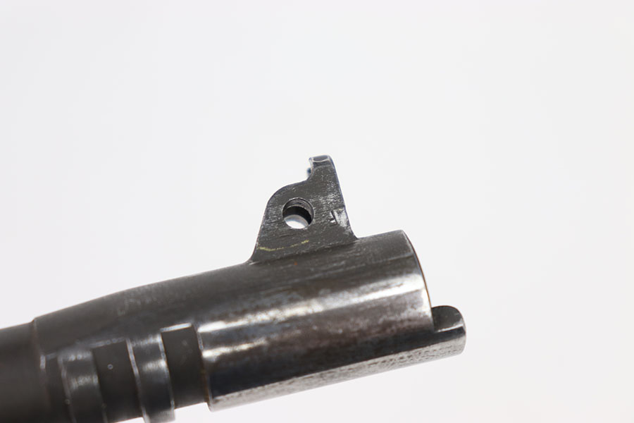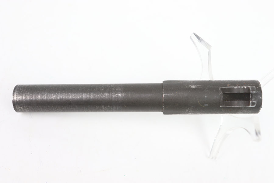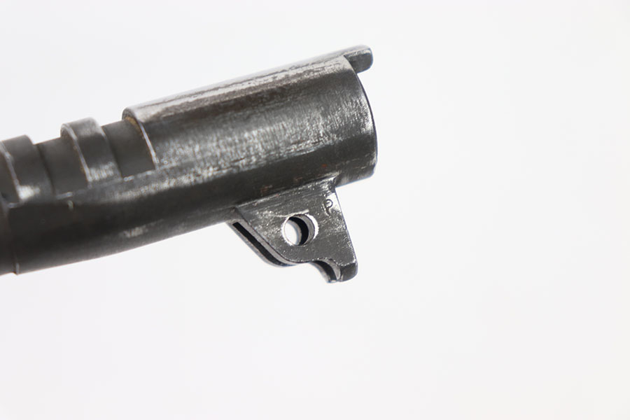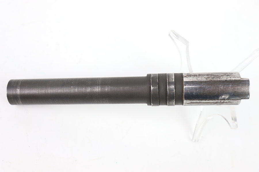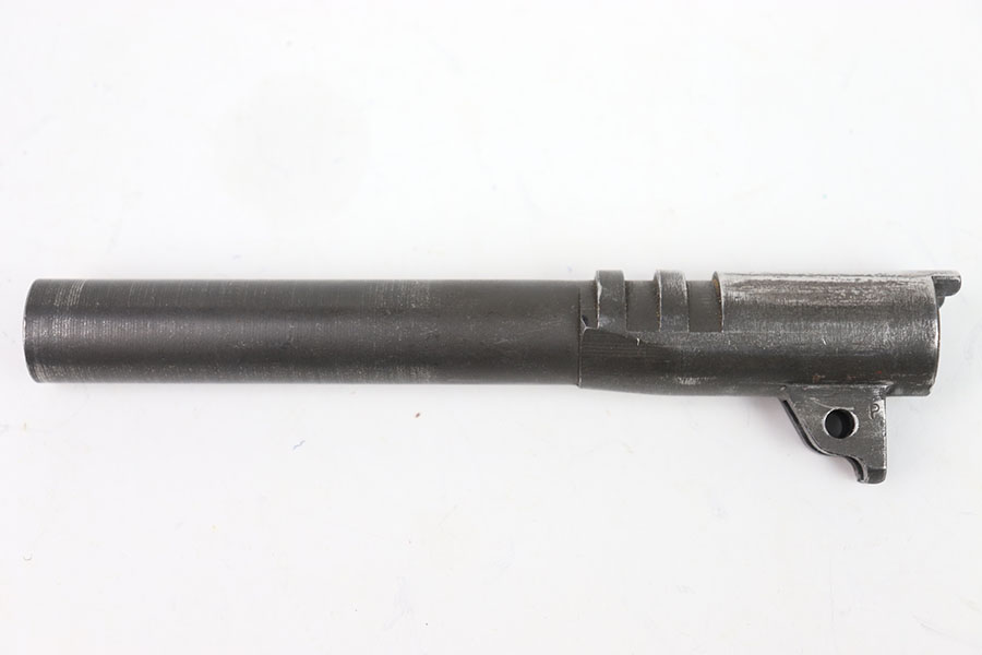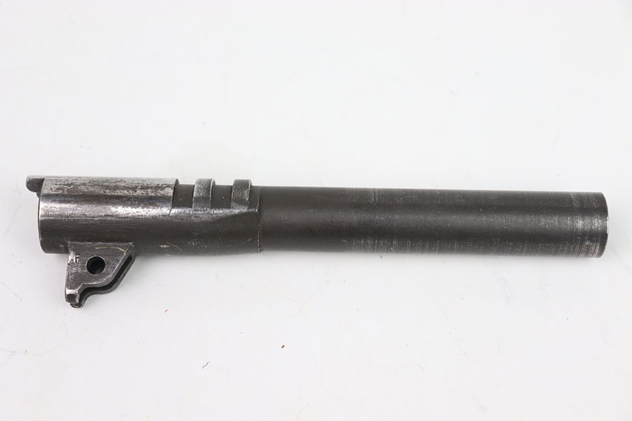 5/31/24 – This is a Flannery Ithaca M1911 barrel. I believe this barrel is commercial due to the polished ejection port area. The lug is marked F on the right side and P on the right. The rest of the finish is in great condition with the majority of its wear closer to the muzzle. The bore is 7/10, not very clean with some speckling throughout, and not very pronounced rifling.