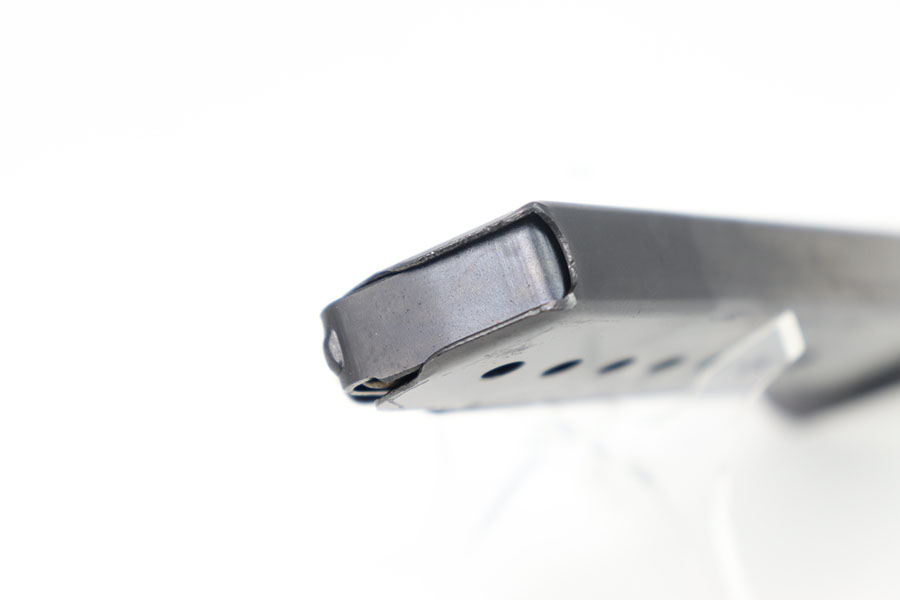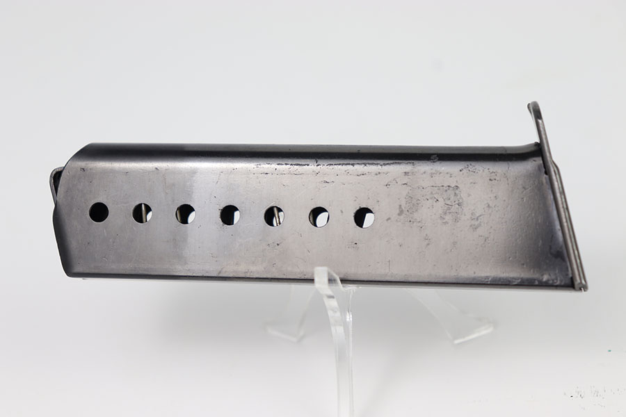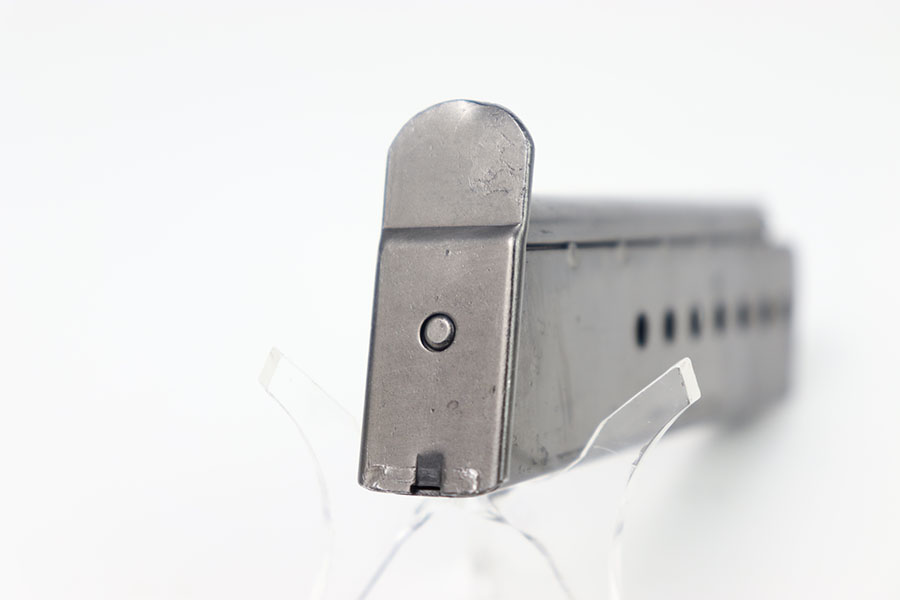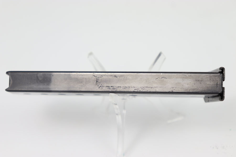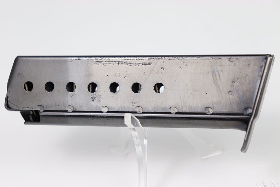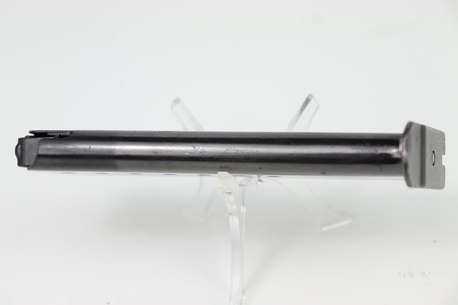 8/8/24 – This is a WW2 Mauser P.38v magazine. This magazine is in good condition but appears to be refinished a high gloss two tone blued finish. There are a few minor spots of oxidation throughout the magazine under the finish. The left side of the magazine is marked P.38v with a WaA135 on the spine. Strong and functional spring.