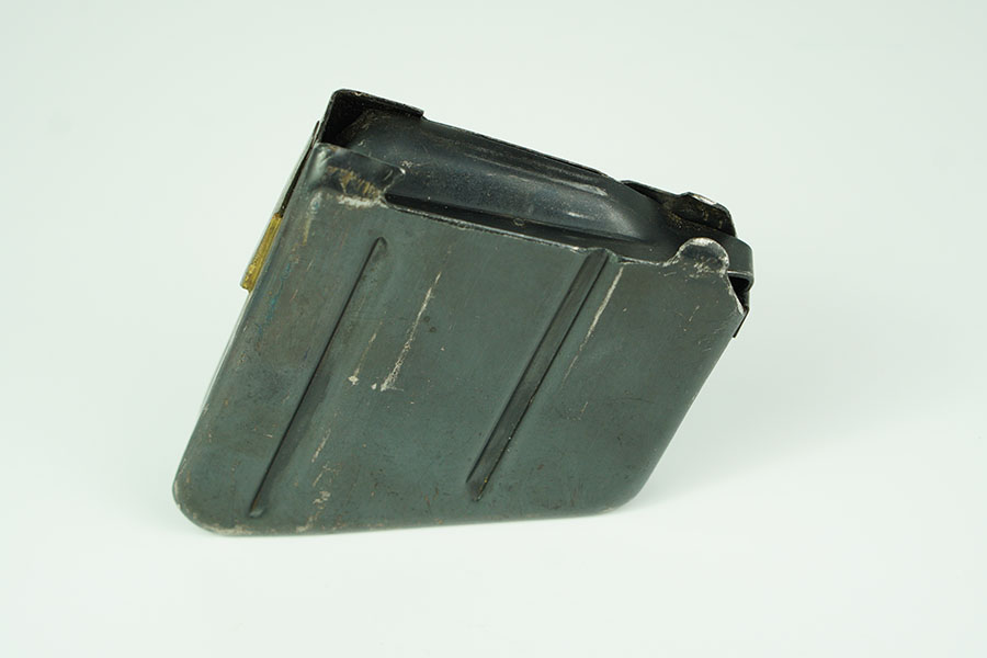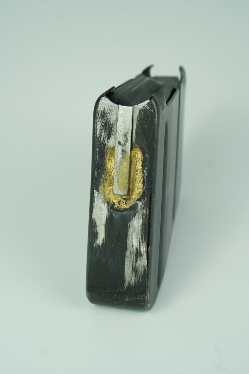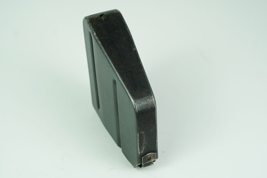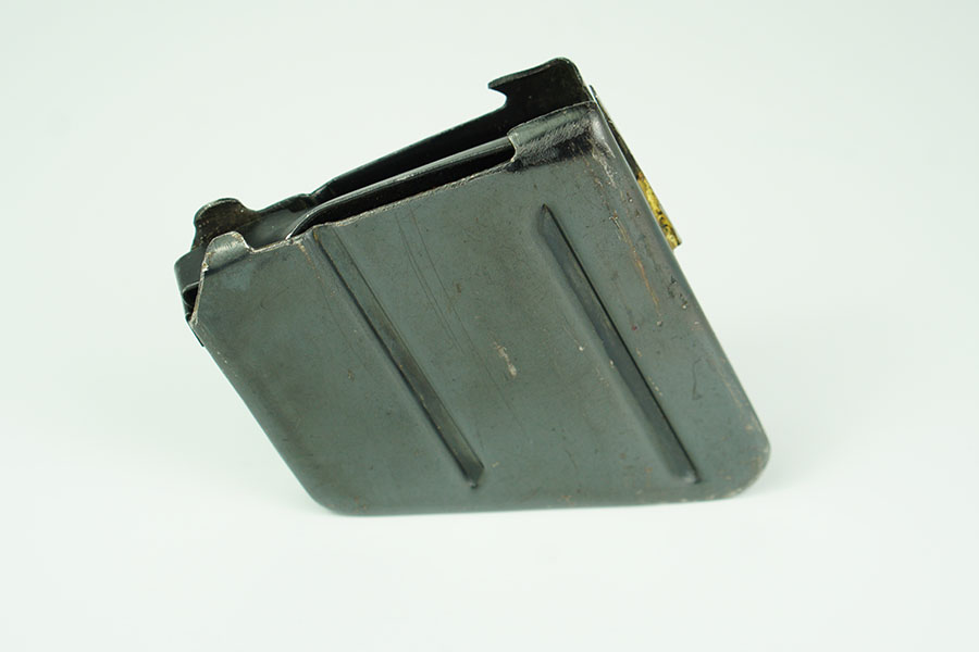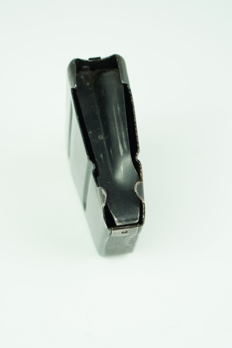 1/23/24 – This is a great example of a WW2 No. 4 Enfield magazine. The magazine has a high gloss finish with few scratches throughout. The majority of the scratches and finish loss are on the backside of the magazine around the metal wedge. This would fit No.4 & No.5 Enfield rifles. Spring and follower functions properly.