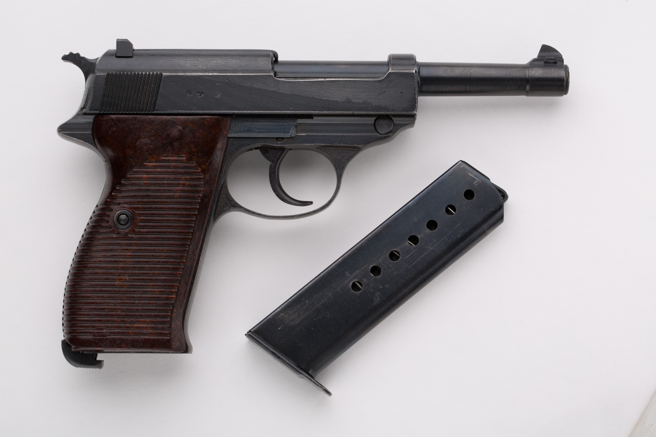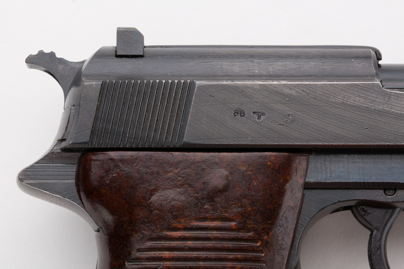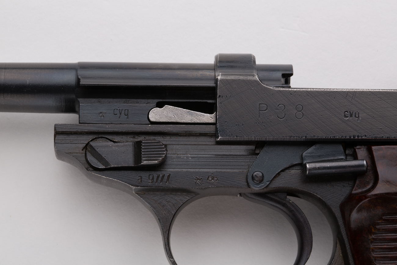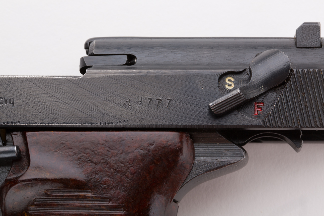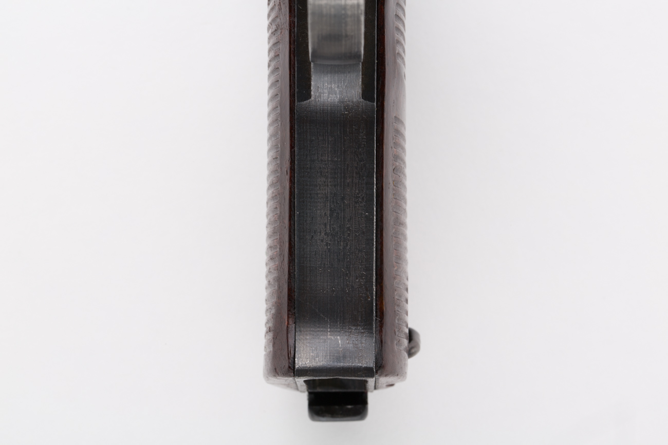 9/29/17 – This is a late-war ‘a prefix’ Spreewerke cyq P.38 in all matching and original condition. About 98% blue remaining with a little thinning on the front strap. Manufactured in February of 1945. Late-war cog hammer. Minty grips and even better bore.