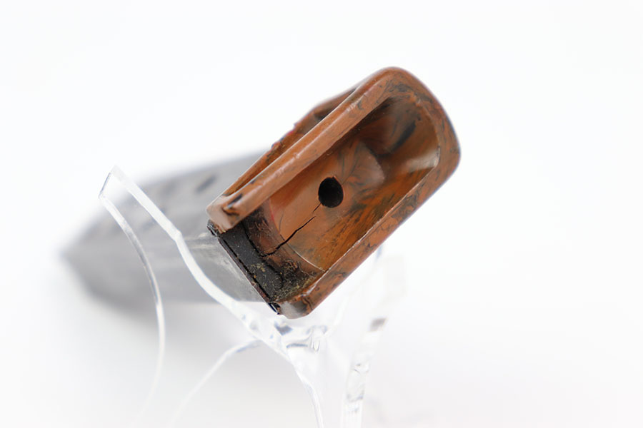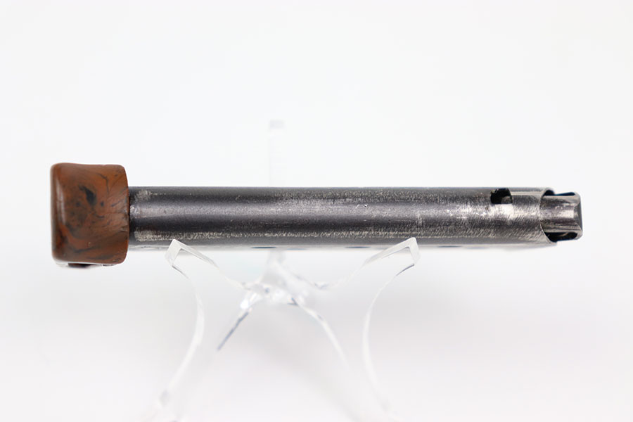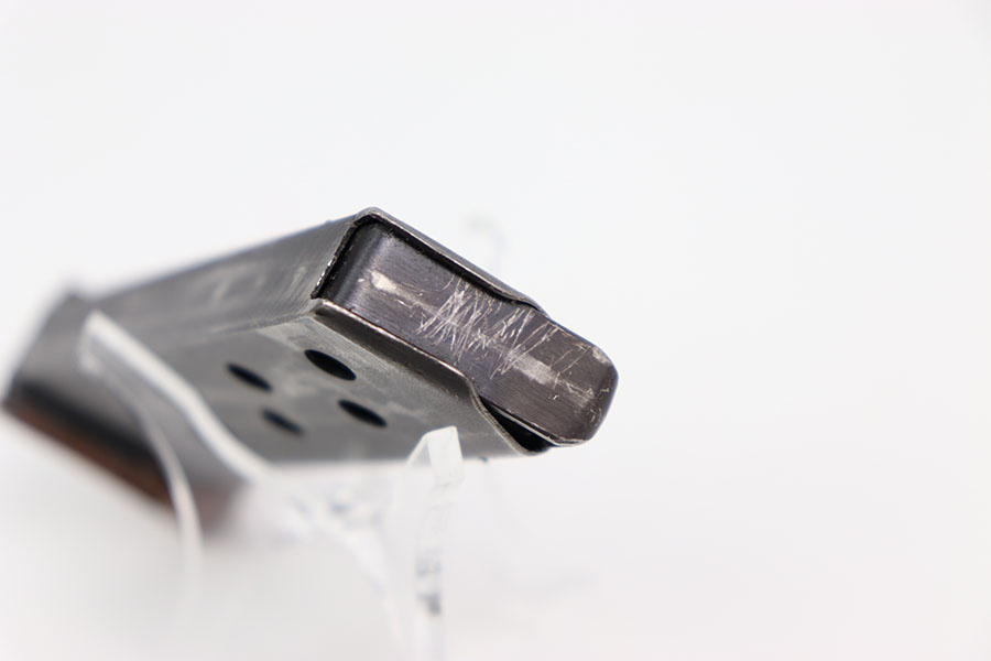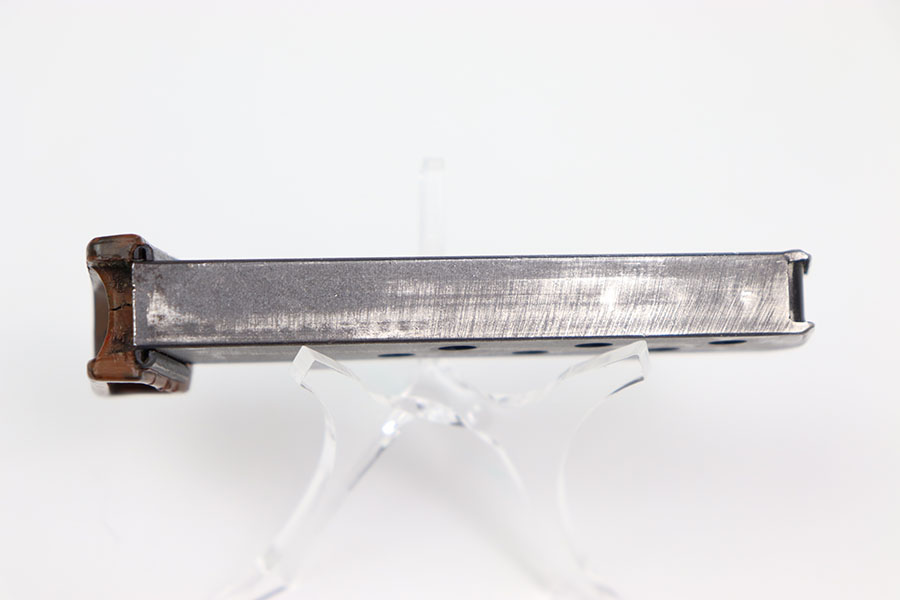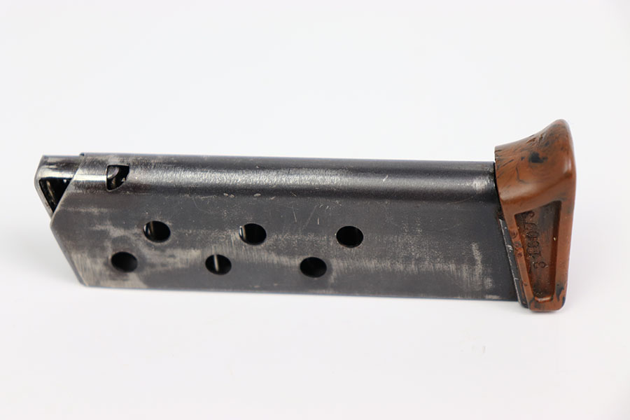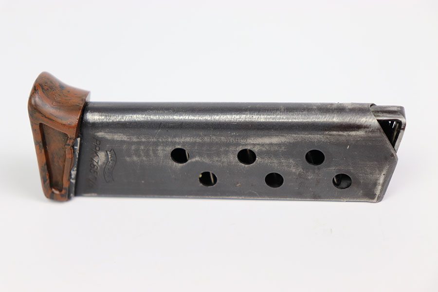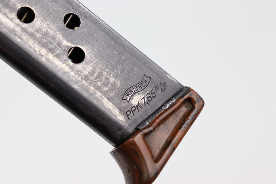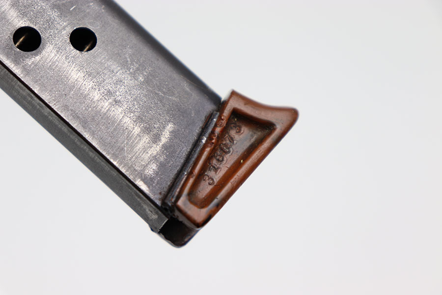 2/14/24 – This is an original wartime PPK finger extension magazine. The magazine has a dull blued finish with a Walther banner and “PPK 7,65m/m” stamp. The dull bluing has honest wear throughout. There is no rust or pitting. The thick-lipped bakelite finger extension has one crack down the middle from the rear of the base to the center hole, as seen in photos. The finger extension is numbered “316073.” Overall the finger extension is in great condition. The spring is strong and fully functional