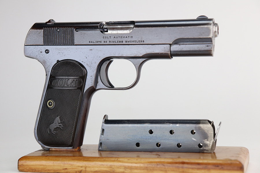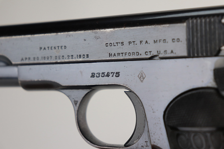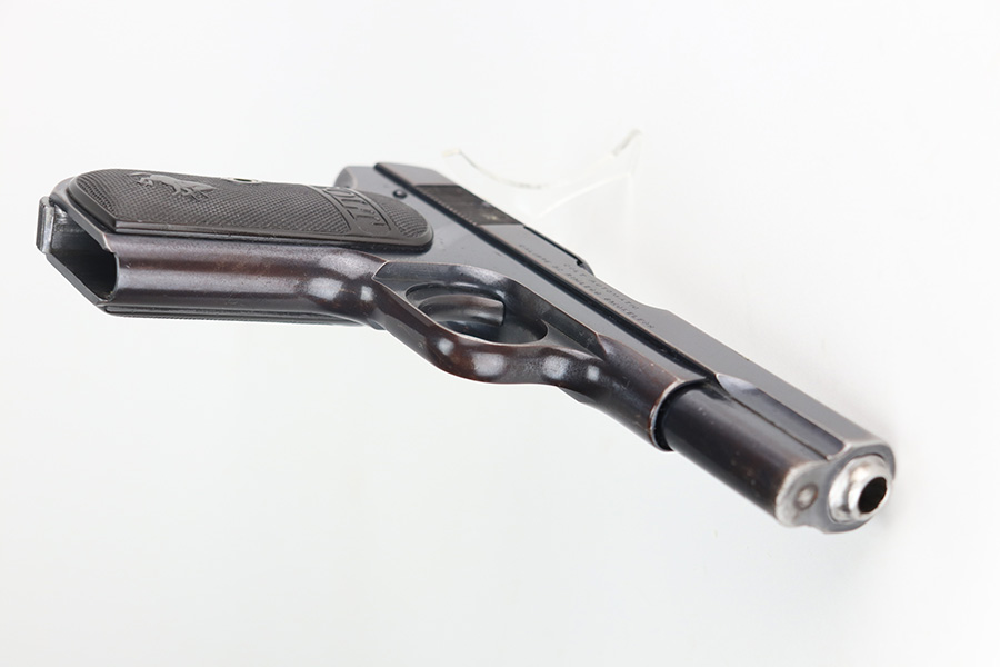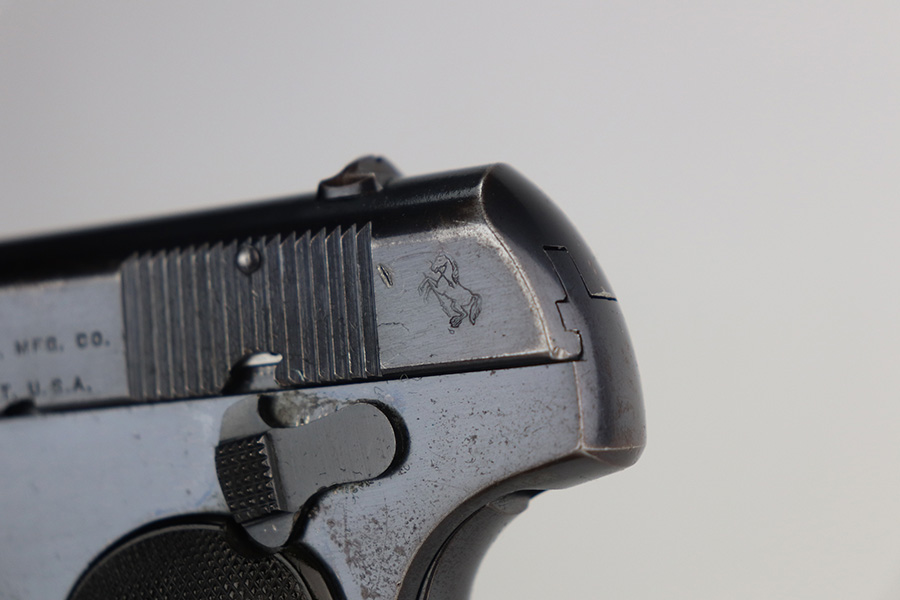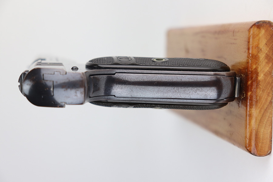 8/9/21 – This is a rare Colt M1903 that was made in 1917 and was part of a contract order by the Belgian government, as indicated by the diamond ‘A’ proof mark on left side of frame. During World War I, Colt made 24,000 Model 1903 pistols to supply the Belgian government. They saw heavy use and had a low survival rate, especially in collectible condition. This one doesn’t have much actual bluing loss, mostly on the high edges of the slide, but there is also some visible oxidation throughout. Excellent original grips and correct two-tone magazine. Bore is shiny with strong rifling but there is a bulge right near the muzzle end of it. The barrels are unmarked and easily replaceable though if the buyer wishes to shoot this one.