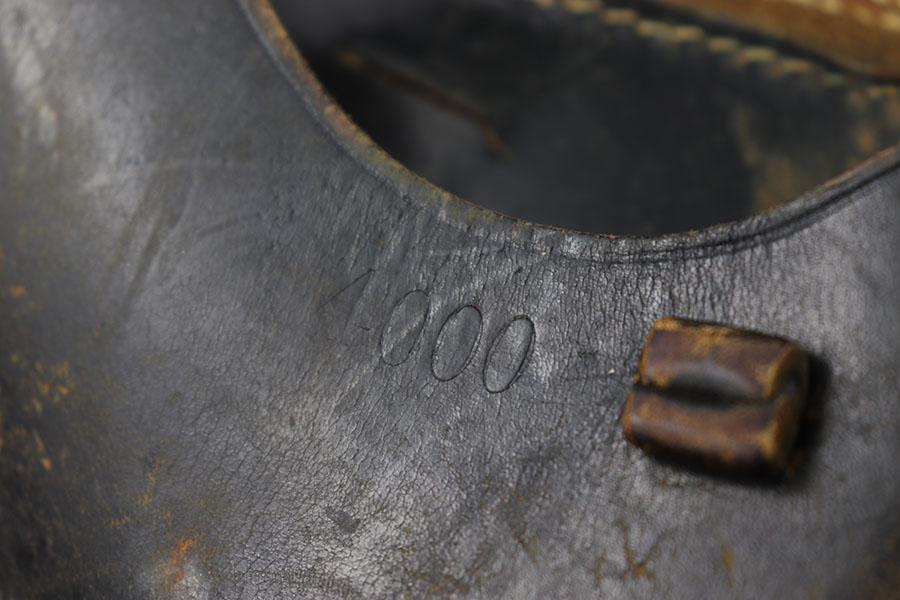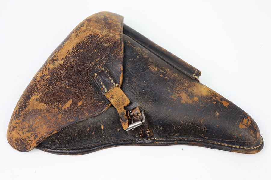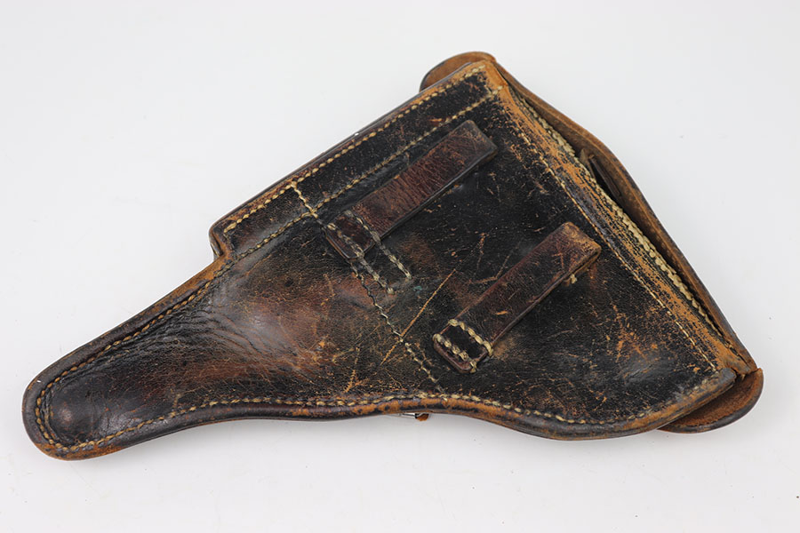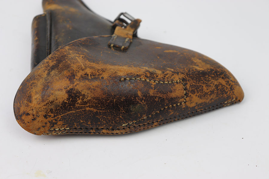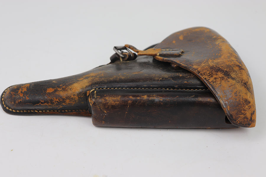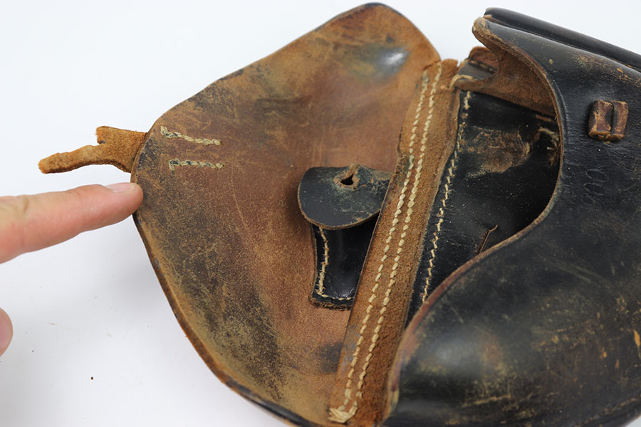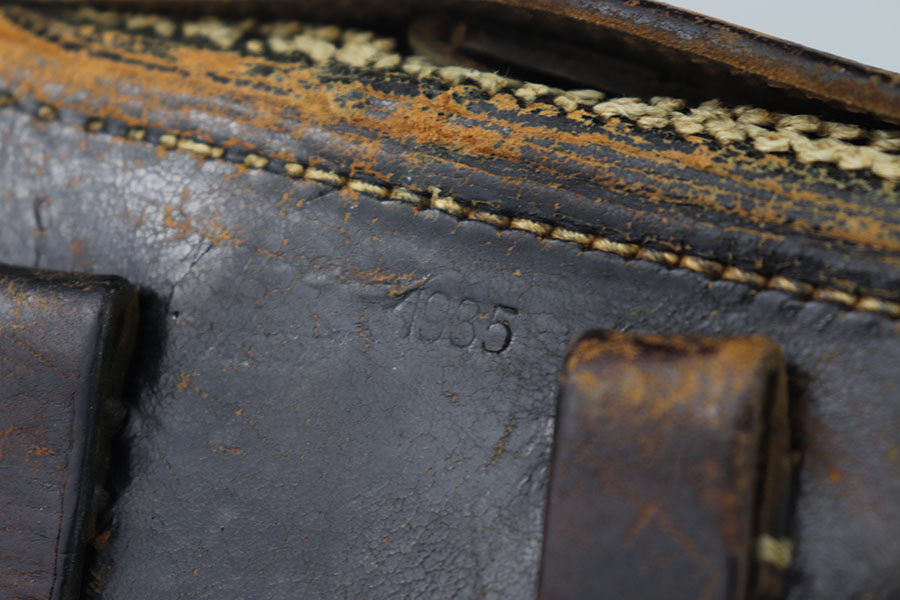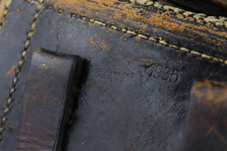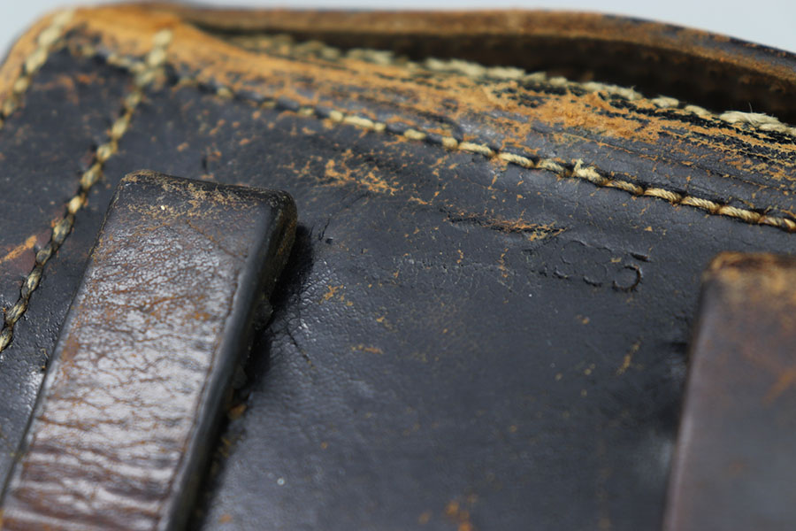 7/12/24 – This is a very rare original G date luger Holster. Unfortunately it is in fair condition with some excessive wear and cracking to the exterior of the holster. The stitching between the closure flap and the body of the holster is partially disconnected but still attached on both ends. The closure strap is torn. The holster is marked under the closure flap with “4000,” on the back of the holster with 1935 and the waffen eagle 142 stamp.