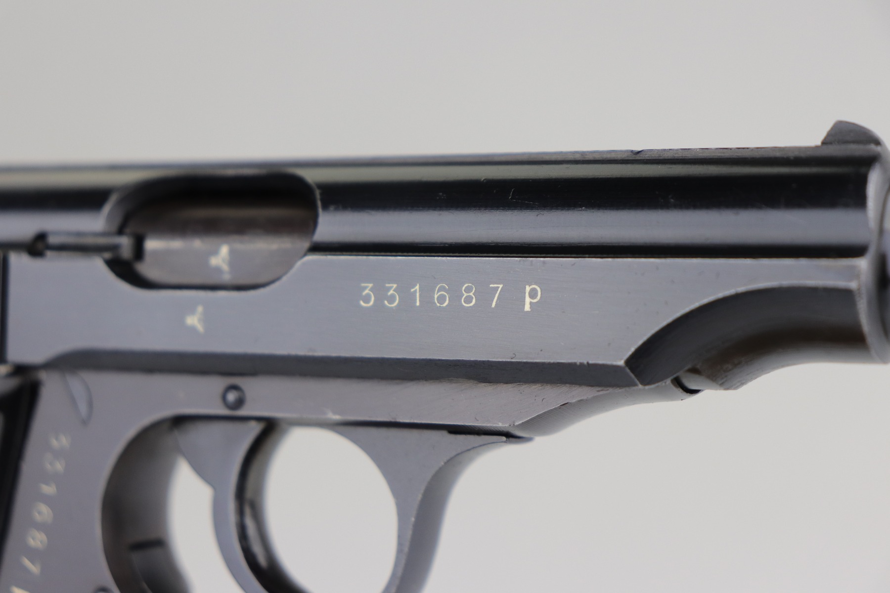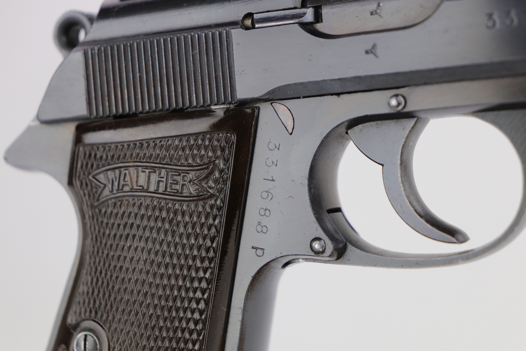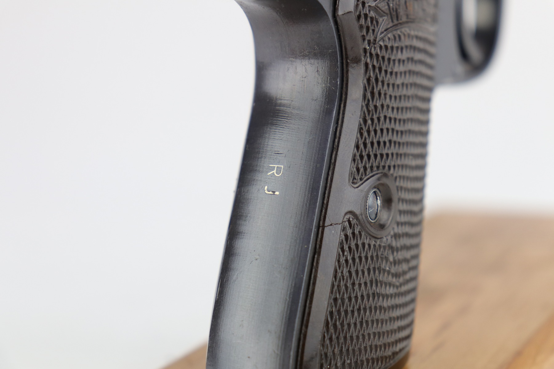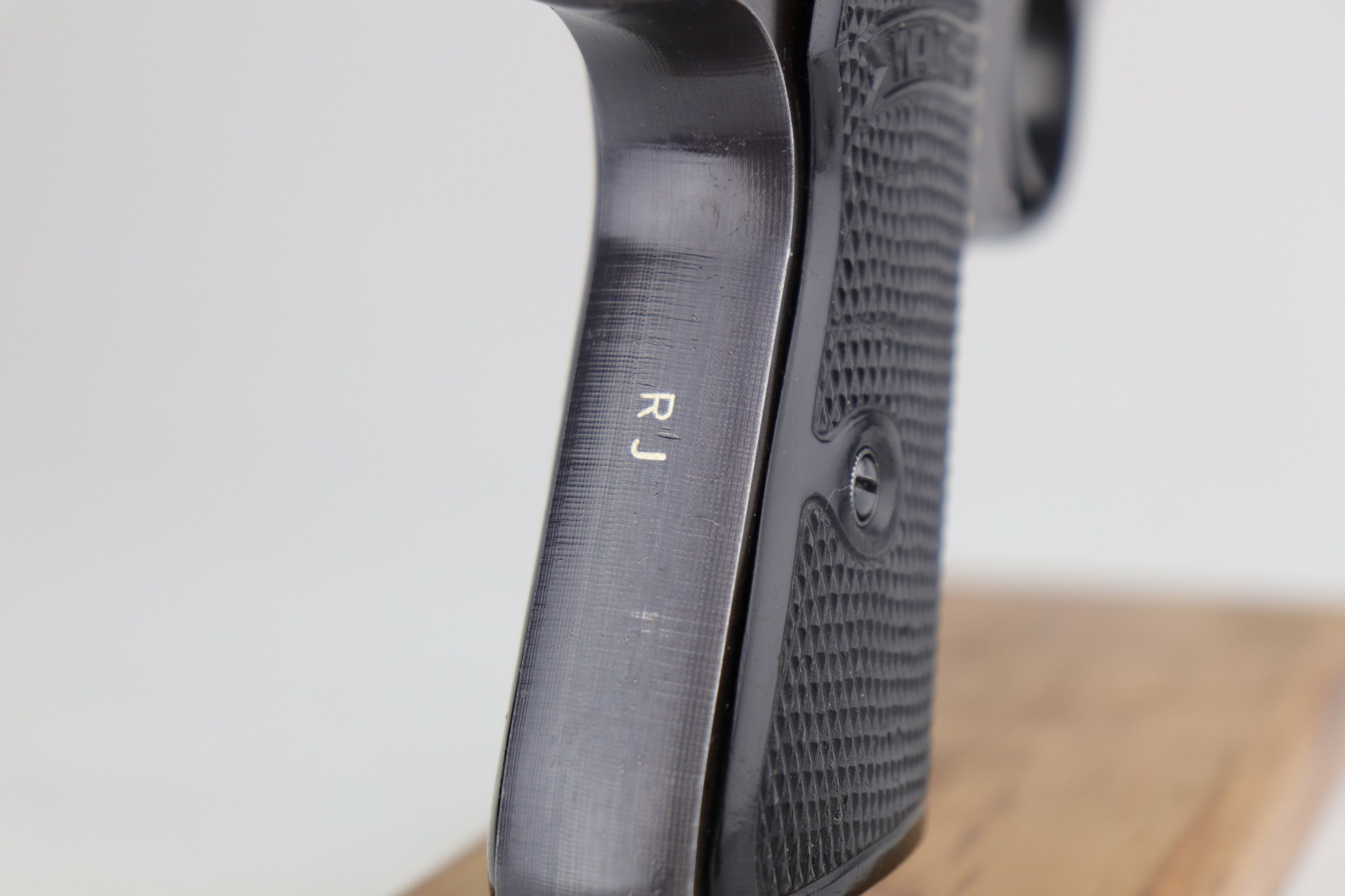 3/6/20 – This is a pair of consecutively numbered Walther PPs with RJ marking on the frame. Not only is it rare to find consecutive serials, but these examples are marked on the back strap, and only about 10-15% of them were marked in that location. They are also both near mint condition, with hardly any finish loss on either pistol. The lower serial does have a lanyard ring on the frame. Both have mint bores, excellent grips and correct magazines. Unlikely to encounter another pairing quite like this any time soon.