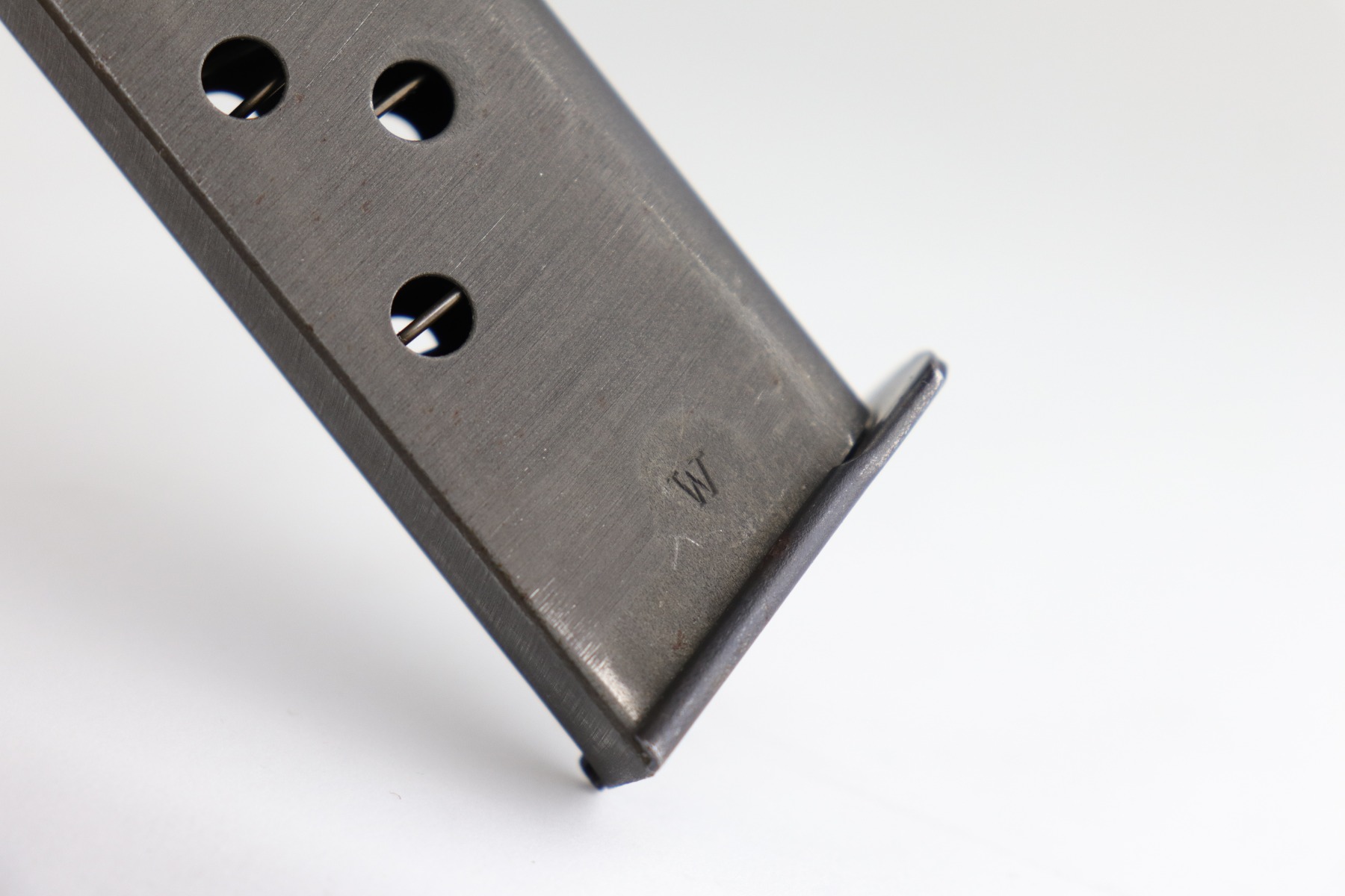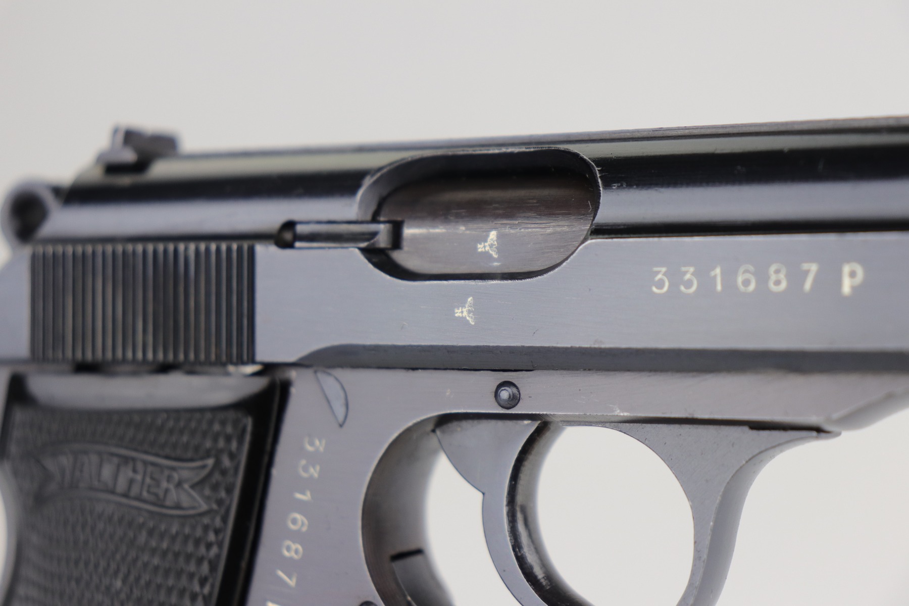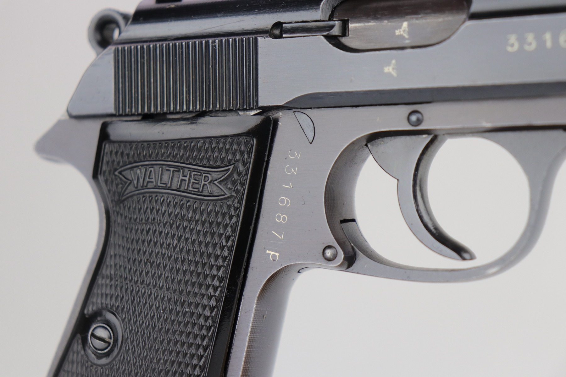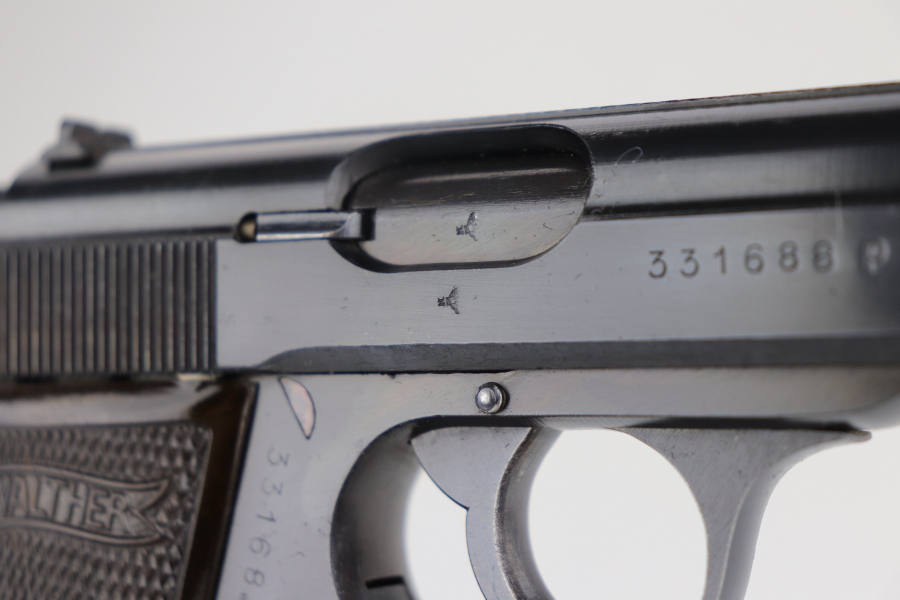 3/6/20 – This is a pair of consecutively numbered Walther PPs with RJ marking on the frame. Not only is it rare to find consecutive serials, but these examples are marked on the back strap, and only about 10-15% of them were marked in that location. They are also both near mint condition, with hardly any finish loss on either pistol. The lower serial does have a lanyard ring on the frame. Both have mint bores, excellent grips and correct magazines. Unlikely to encounter another pairing quite like this any time soon.