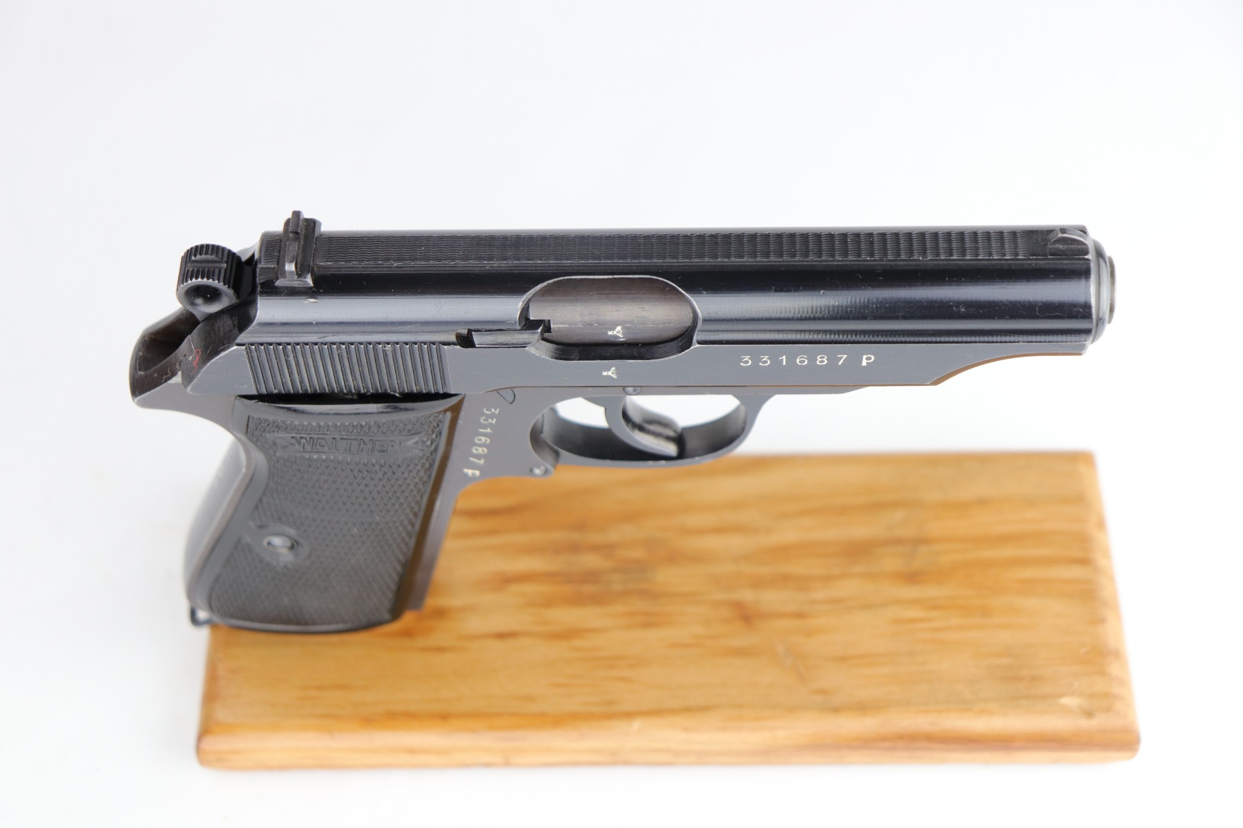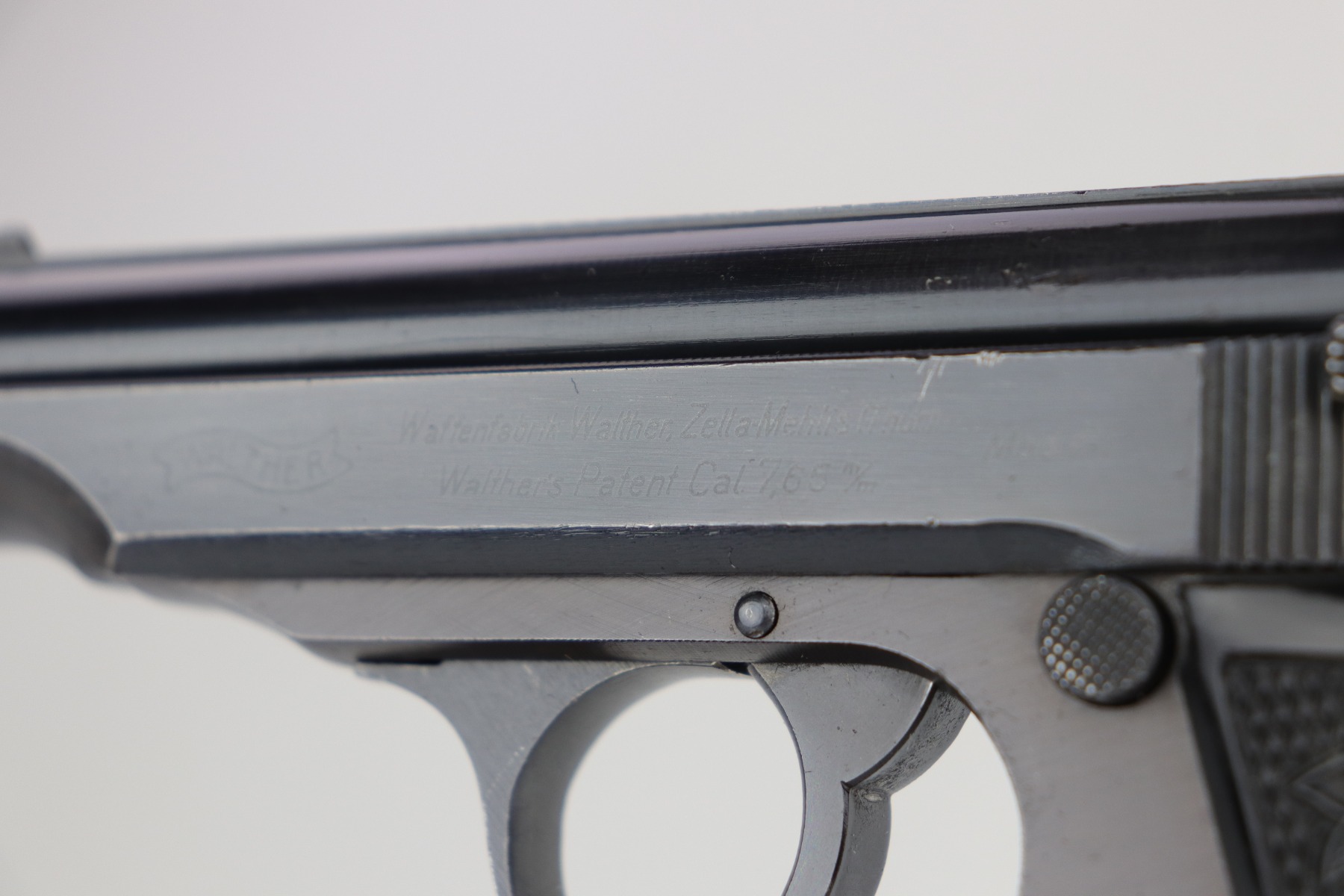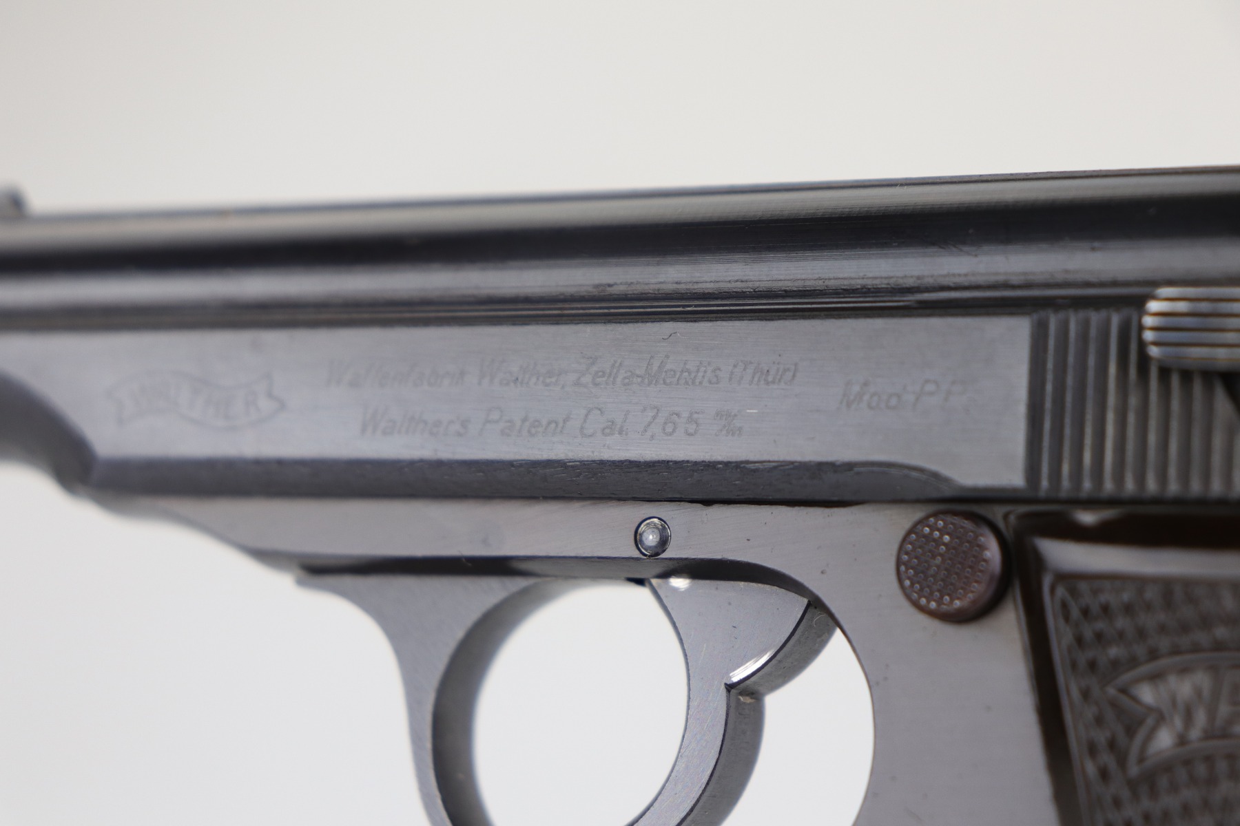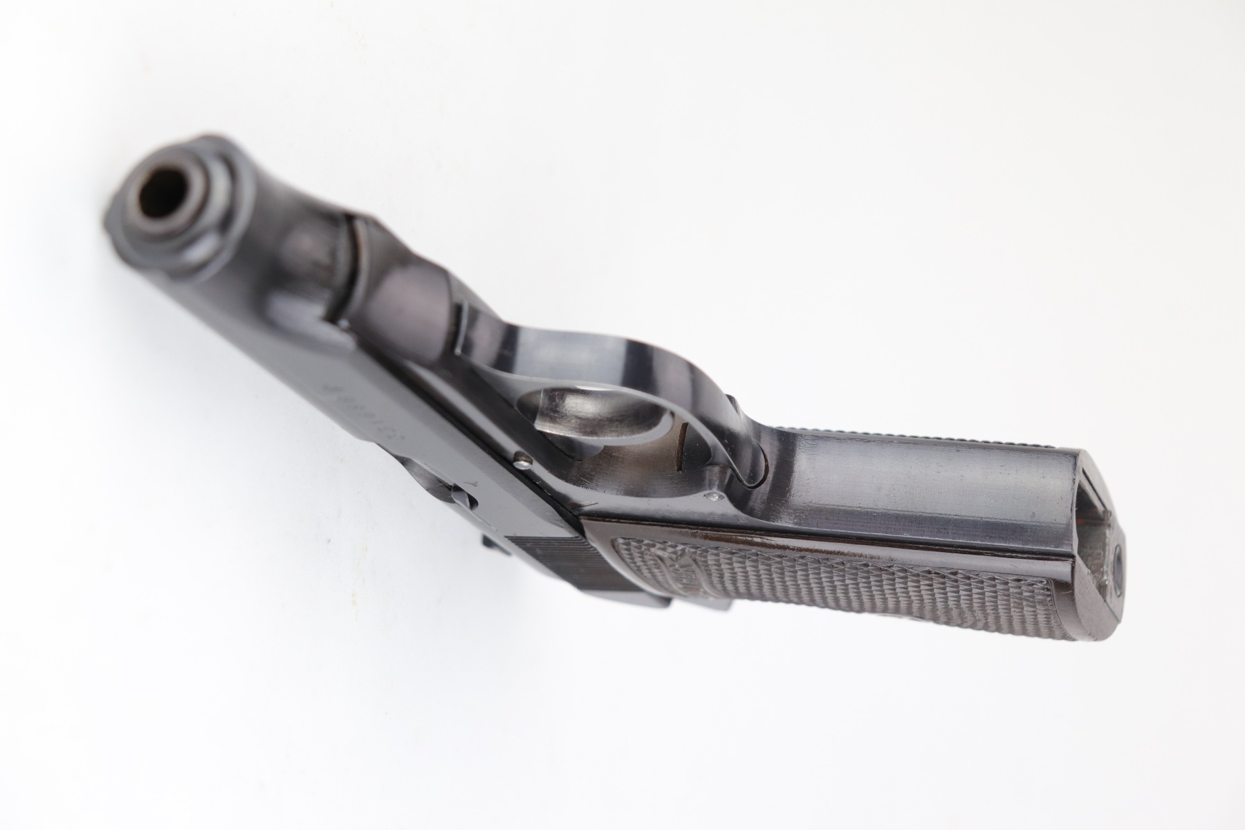 3/6/20 – This is a pair of consecutively numbered Walther PPs with RJ marking on the frame. Not only is it rare to find consecutive serials, but these examples are marked on the back strap, and only about 10-15% of them were marked in that location. They are also both near mint condition, with hardly any finish loss on either pistol. The lower serial does have a lanyard ring on the frame. Both have mint bores, excellent grips and correct magazines. Unlikely to encounter another pairing quite like this any time soon.