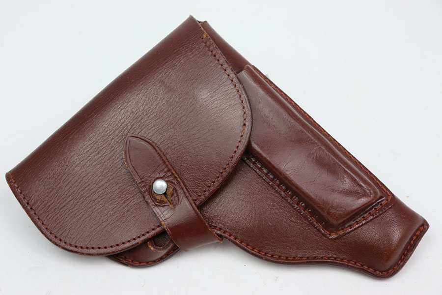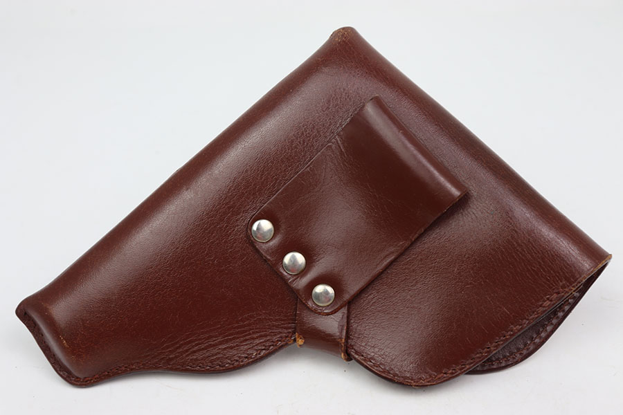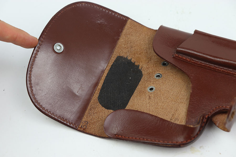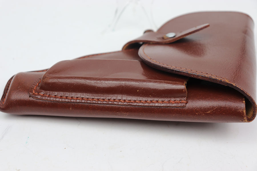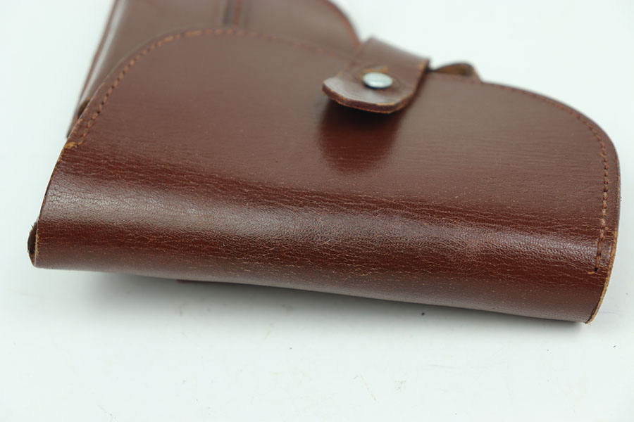 7/30/24 – This is an unmarked holster for a 7.65mm pistol, like a CZ 27, Sauer 38h, or Mauser HSc. The style is similar to other CZ 27 holsters we’ve seen, but this one has a different style knob and closure strap. The holster is in minty condition with very little signs of use. The interior is very clean. No stitching issues.