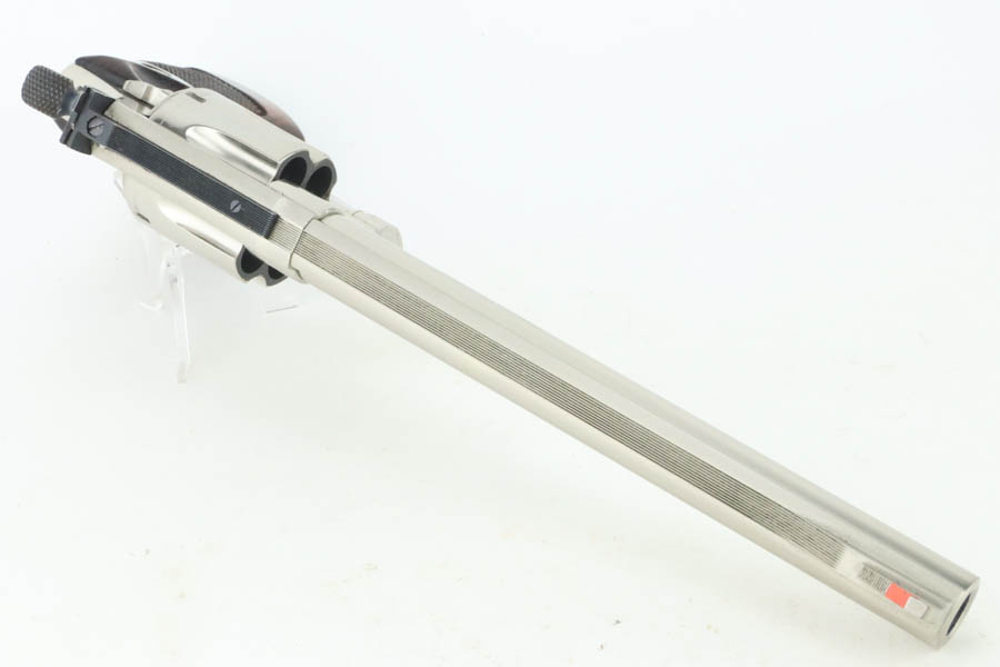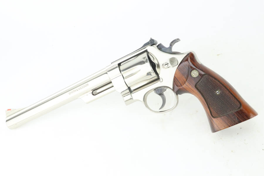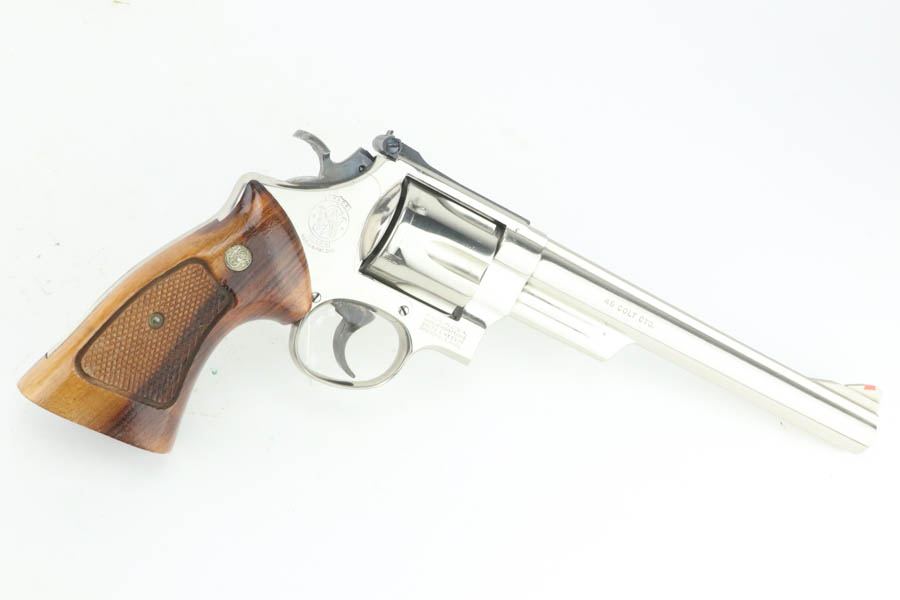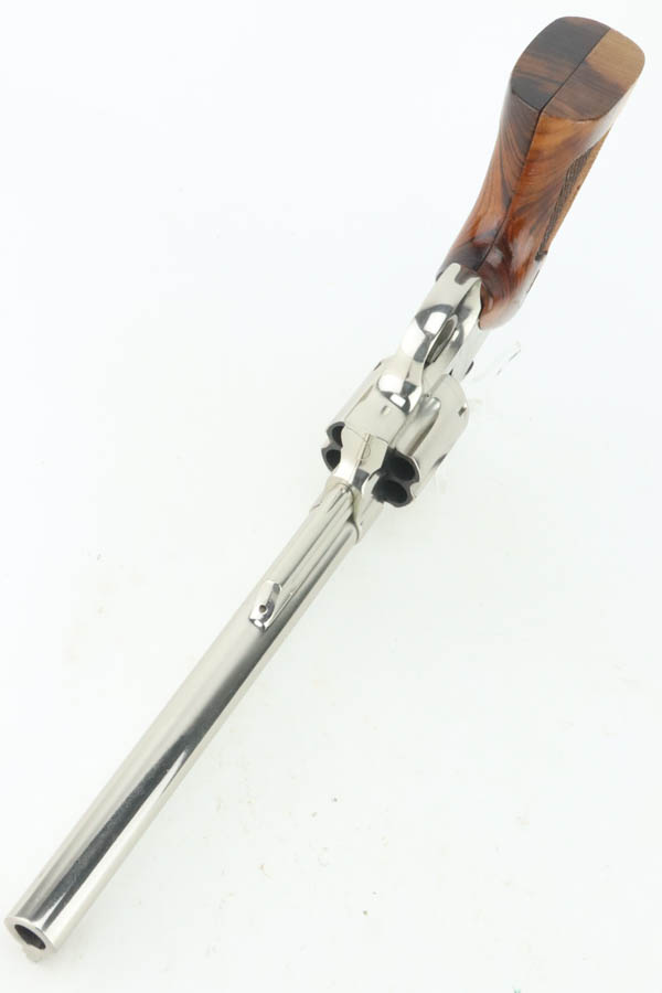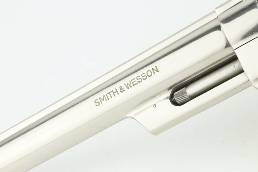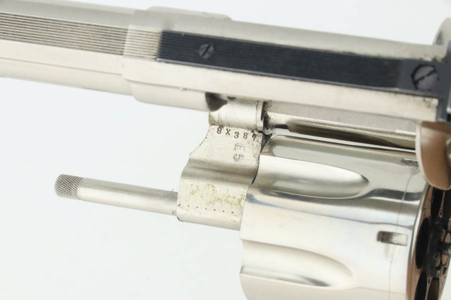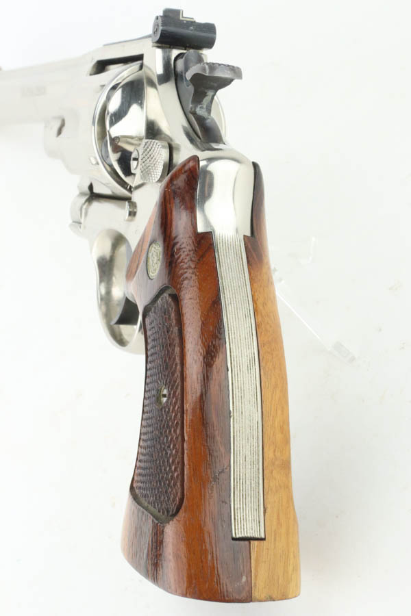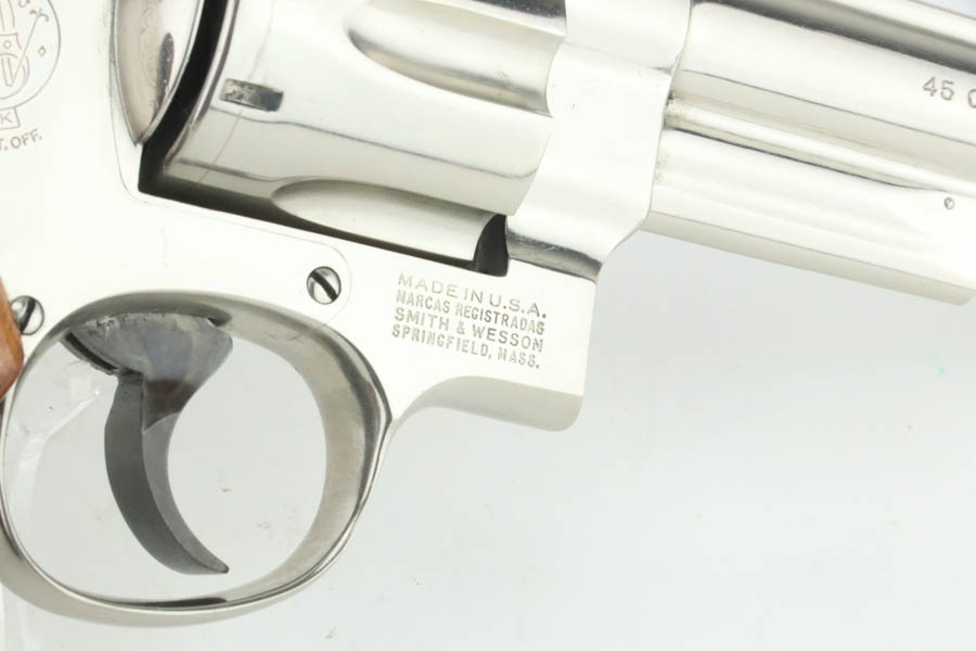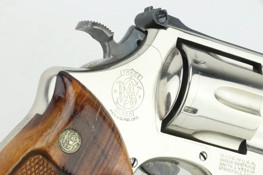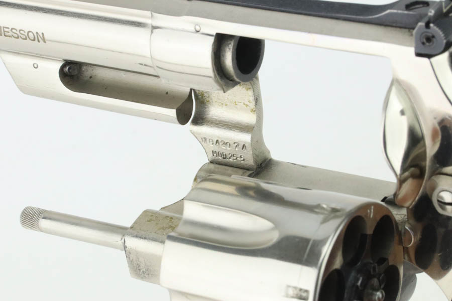 08/09/2024 – For sale is a Smith & Wesson Model 25-5 revolver chambered in .45 LC. The revolver was produced sometime between 1981 and 1983. The revolver has a nice polished nickel finish but has some minor handling scratches visible. The grip is in great condition with no cracks or breaks. The bore is bright with great rifling. Some of the original case colored finish are visible on the trigger and hammer.