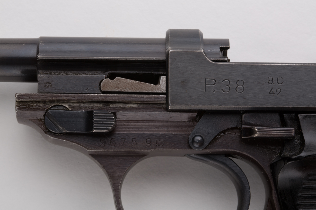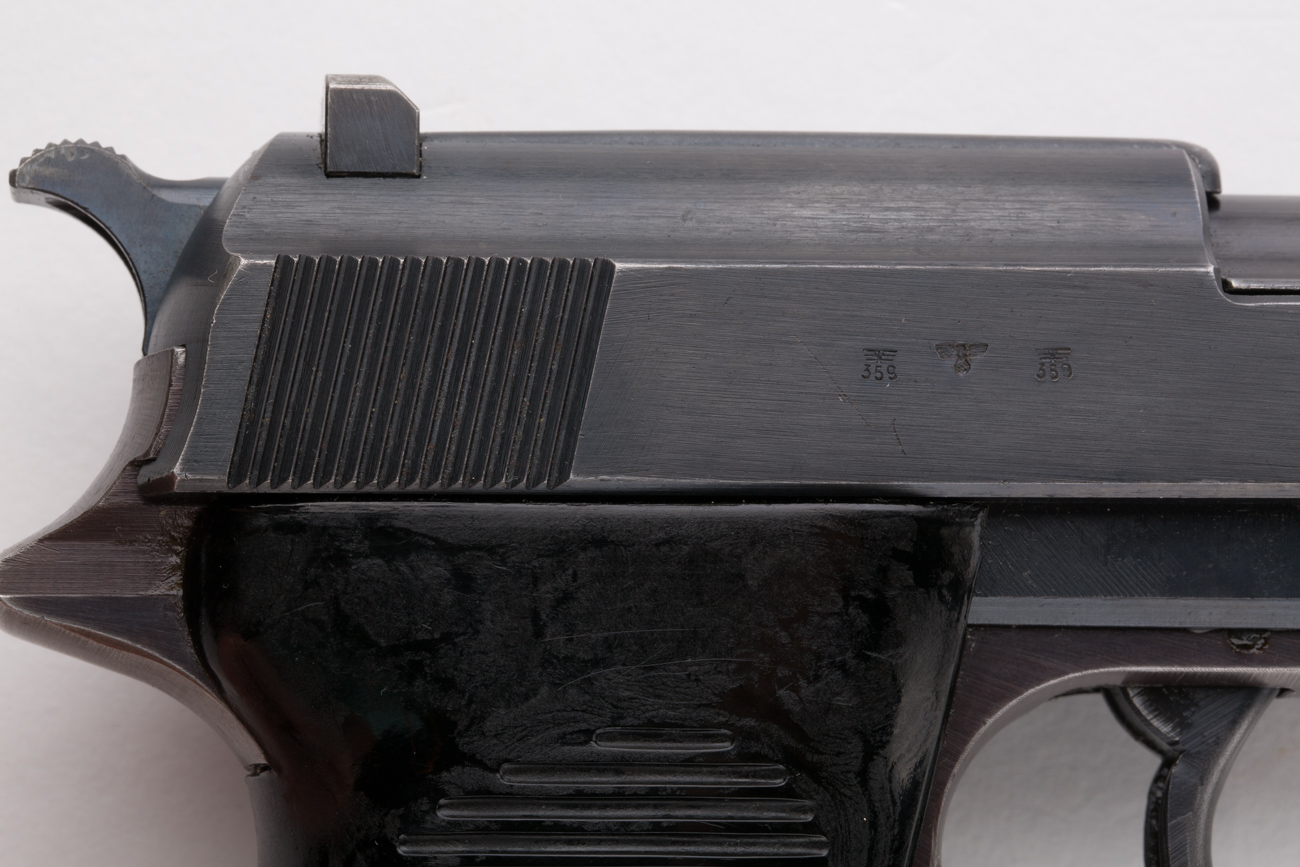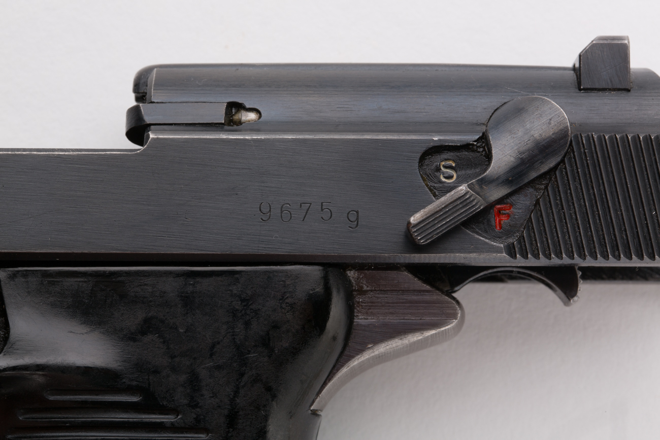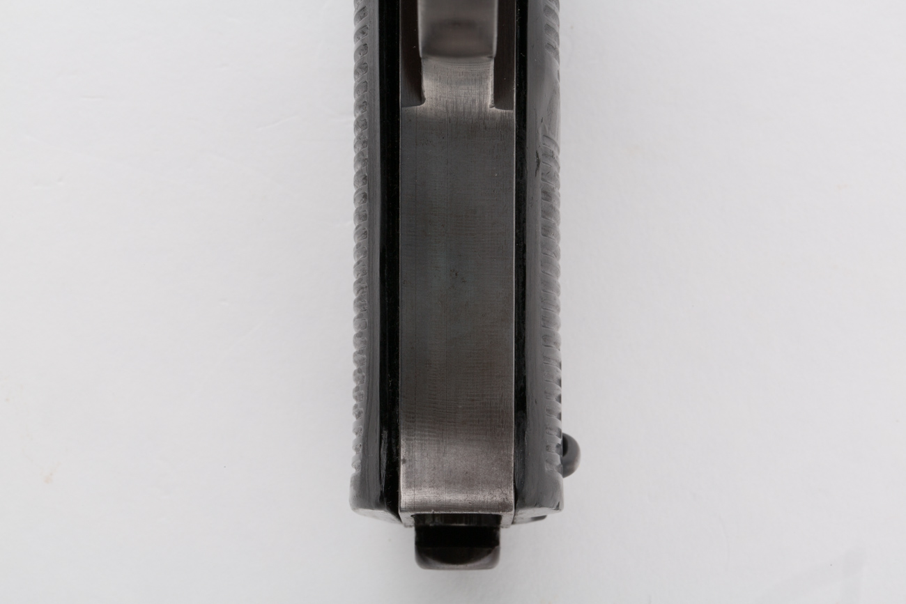 9/29/17 – This is a Walther P.38 from 1942 – all original and matching. Manufactured in August of ’42, it has about 95% blue remaining. The slide is minty but the frame shows some thinning on the front strap. Given the uniform nature of the thinning and the excellence of the slide, it’s possible it left the factory this way. Minty bore and excellent grips.
