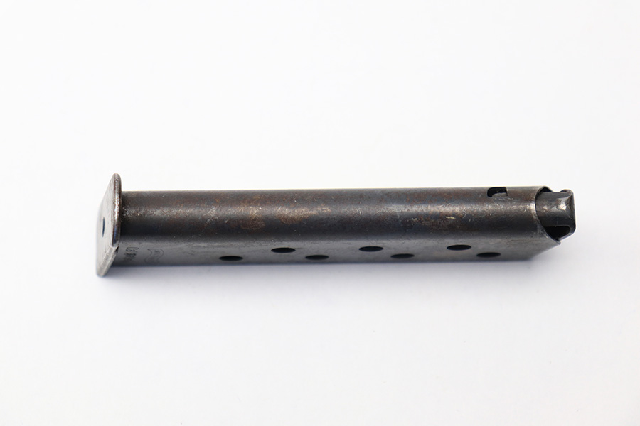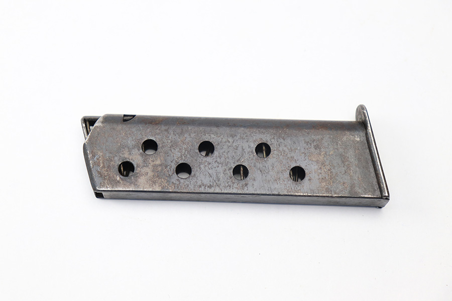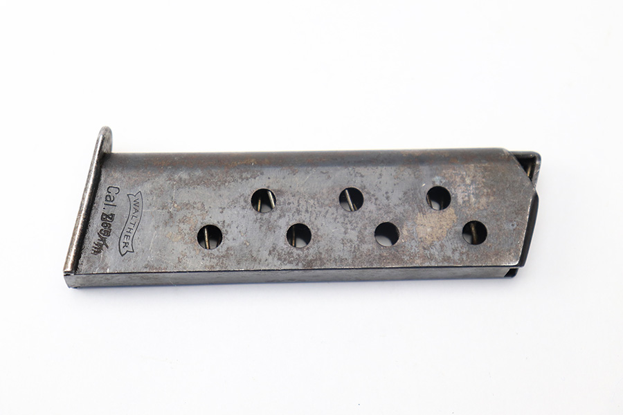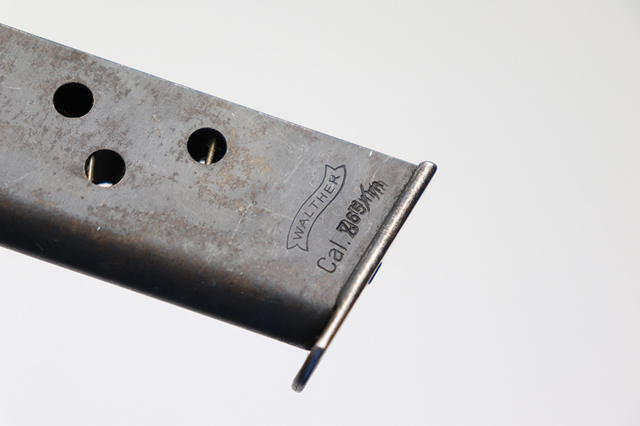 12/1/21 – This is an original Walther PP magazine from WW2 with an unusual factory error. It appears as though the tube was incorrectly stamped 9mm and then later corrected and over-stamped with 7.65mm caliber information. See photos. The magazine has light patina throughout and surface wear / discoloration. Strong, functional spring.