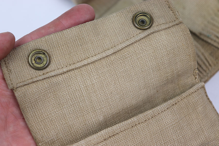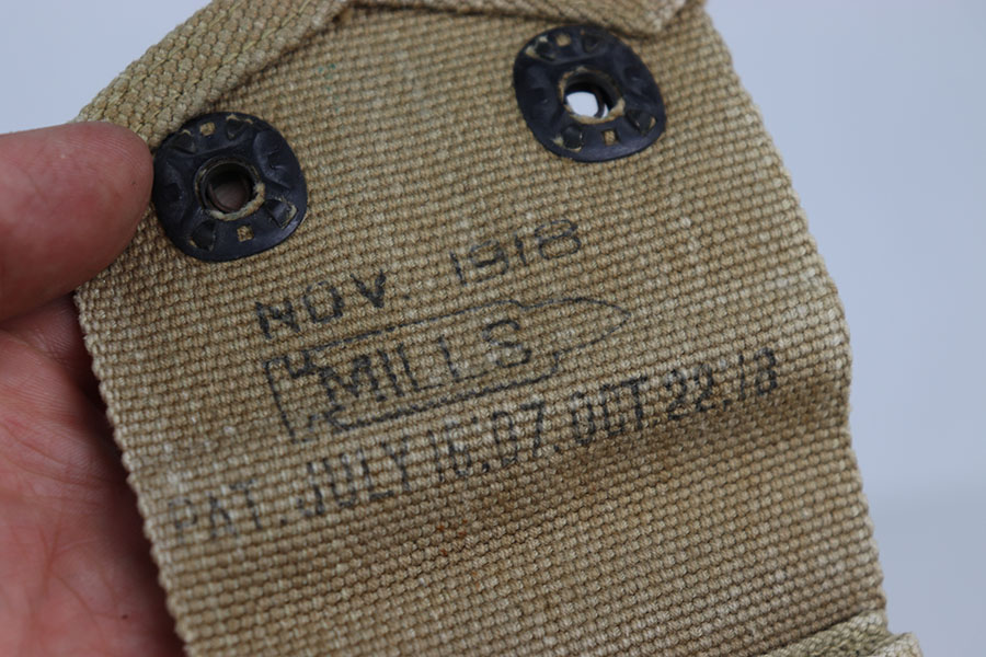 6/26/24 – This is an original WW1 canvas belt, 1911 dual-magazine pouch, and medical / first aid pouch. All components are in excellent condition with clean, light tan canvas material with very little signs of use or wear. The belt has no tears or damage to its stitching. The Magazine pouch is ink stamped F 10 on the backside as well as ” NOV 1918 MILLS Pat…” on the inside. This pouch is in excellent+ condition. All metal fixtures and buttons are excellent and fully functional.