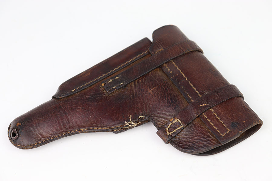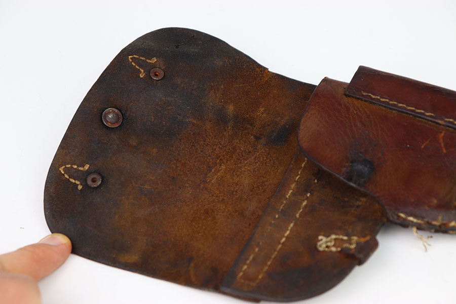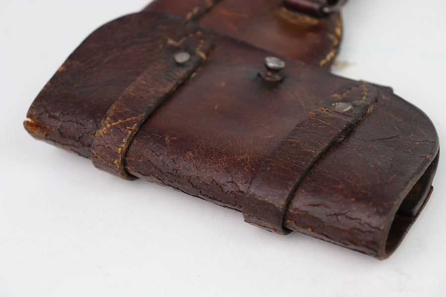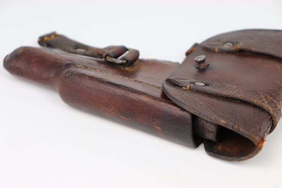 3/7/24 – This is an original luftwaffe dropping style holster for a 1922 FN or Femaru model 37. The holster is in average condition with a fair amount of cracking throughout the front side of the leather holster. Most the cracking is only surface level and doesn’t fully pass through. There is one tear on the edge of the top of the closure flap. The strap that goes over the holster has some cracking/tearing around the stitching on the inside face of the holster but is still attached (in the picture this will appear on the right side). The closure strap is in great condition as well as the rest of the inside facing external surfaces of the holster. Some of the stitching to the left of the closure strap appears to have loosened and was tied off to prevent further wear. The inside of the holster is in great condition with typical wear but no severe damage, cracks, or issues. This holster is completely unmarked.