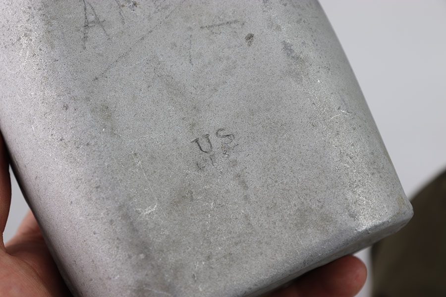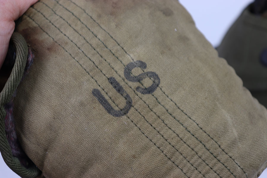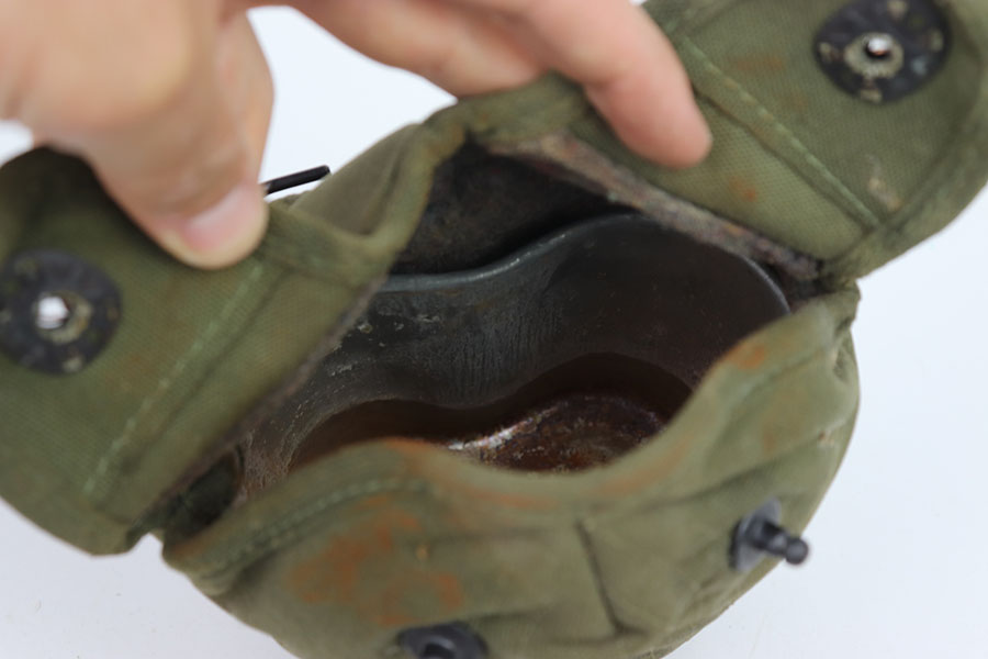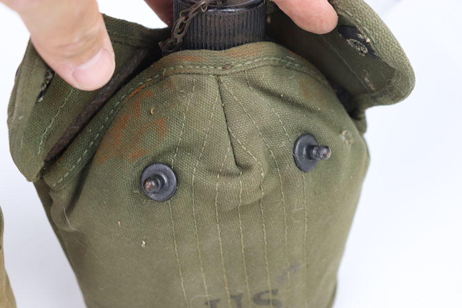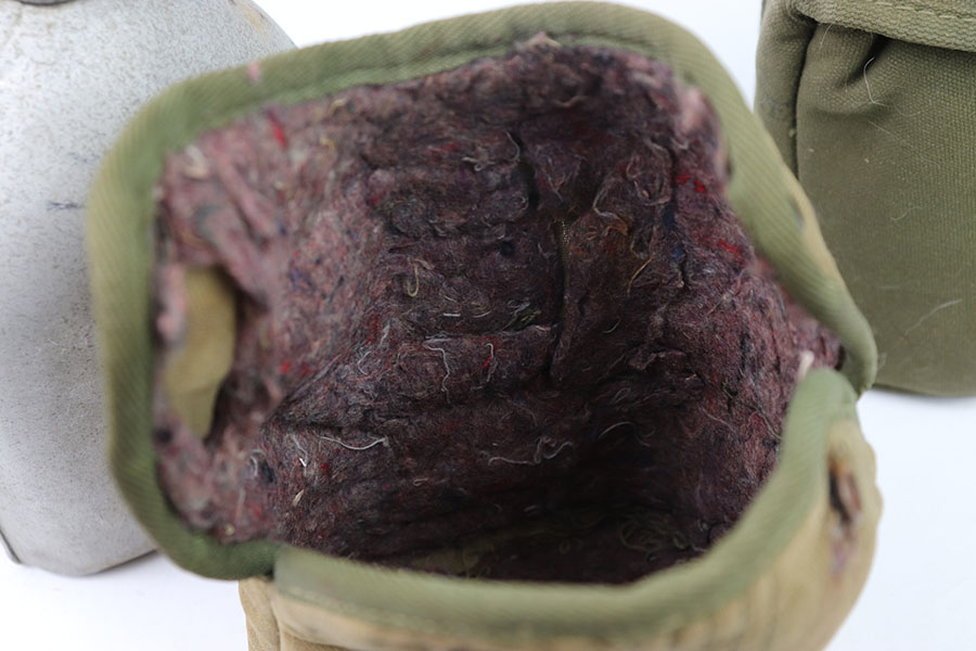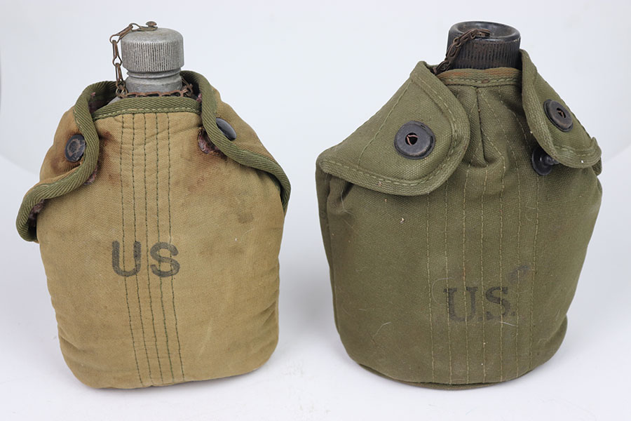 7/12/24 – These are original WW2 era US marked Canteen and Pouches. One in a lighter tan and the other in green. The tan one is in great condition with some rust stains. The buttons work they just have some moderate amounts of rust as well as the metal belt hook. This canteen pouch is US marked on the front, with a nice inside. The green canteen pouch is in excellent shape, it is US marked on the front and maker and dated 1942 on the side. Both canteens are in great condition, the one in the light tan pouch is US marked.