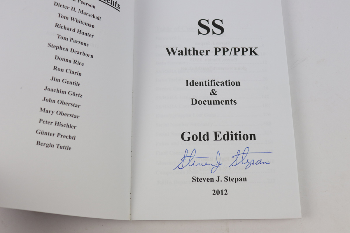 10/3/18 – This is a copy of Stepan’s book on SS Walther PP/PPK pistols: Identification & Documents, Gold Edition (revised edition). The book is signed by the author on the interior page. 228 pages total – paperback copy has minimal damage to the outer cover, but all interior pages are excellent.